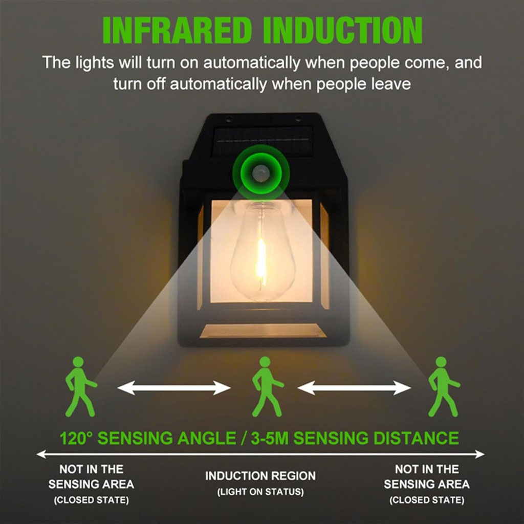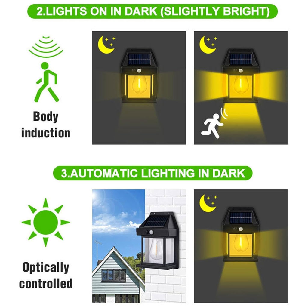 تحكم تلقائي (من الغسق حتى الفجر): بفضل مستشعر الضوء المدمج، يشتعل المصباح تلقائياً بمجرد غياب الشمس وينطفئ عند الشروق. لا حاجة للتشغيل اليدوي أبداً؛ فقط قم بتركيبه واستمتع بـ 8 ساعات من الإضاءة الدافئة.