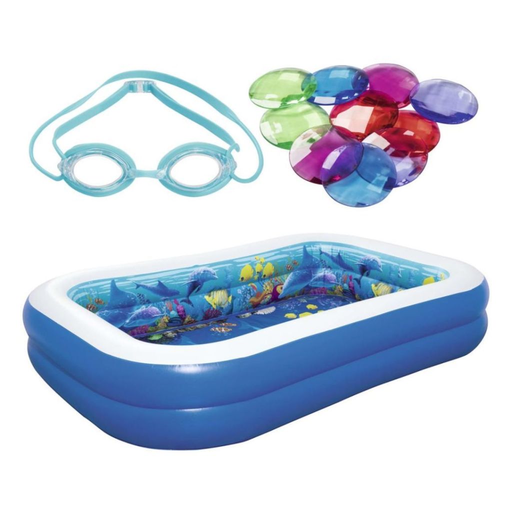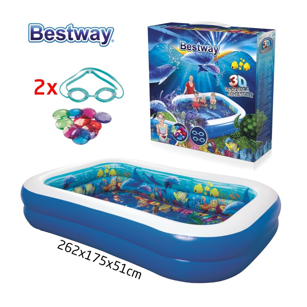 Vos enfants profiteront d'une aventure sous-marine magique avec cette incroyable piscine gonflable Bestway 54177. Grâce à sa construction en I en vinyle de haute qualité, cette piscine est robuste et durable et peut contenir jusqu'à 778 L d'eau. La piscine est conçue avec des parois latérales extra-larges pour plus de stabilité. Cette piscine peut être rapidement gonflée et dégonflée. Mettez les lunettes 3D et émerveillez-vous devant le magnifique monde sous-marin et les trésors de cristal sous vos yeux ! La livraison comprend 1 piscine, 2 paires de lunettes 3D et 1 pack de cristaux. • Caractéristiques du produit : • Dimensions : 262 x 175 x 51 cm (L x l x H) • Capacité en eau : 778 L • Deux valves à dégagement rapide emboîtables • Vinyle résistant et pré-testé • Parois latérales extra-larges • Vanne de vidange facile à utiliser • Patch de réparation robuste • La livraison comprend : 1 piscine, 2 paires de lunettes 3D, 1 pack de cristaux • Numéro d'article Bestway : 54177