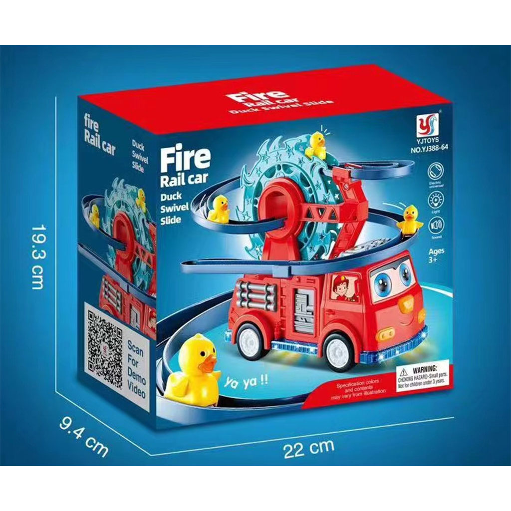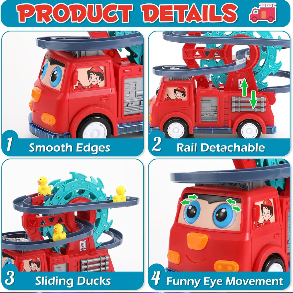 【Voiture camion de pompiers 4 en 1】-Le jouet camion de pompiers pour les tout-petits comprend un grand camion de pompiers et trois canetons jaunes, le camion de pompiers est livré avec sa propre grande roue qui tourne et une piste de glissement pour que les canetons glissent après avoir atterri de la grande roue, ce qui ajoute de l'amusement au jeu et attire l'attention des enfants. (Ce produit nécessite 2*piles AA, qui ne sont pas incluses dans l'emballage). • 【Lumières clignotantes et sons réels】-Avec des lumières clignotantes et une fonction musicale claire, ce camion de pompiers jouera des chansons et fera clignoter des lumières colorées pendant le processus de conduite, et la grande roue sur le corps tournera également automatiquement pendant le processus de course, et les canetons glisseront sur la piste dans l'ordre, apportant une joie et une surprise sans fin aux enfants ! • 【Sûr et durable】-Simplement appuyer sur l'interrupteur en bas et le camion de pompiers pour tout-petits se met en route avec trois canetons à la remorque, avec des yeux à l'avant qui patrouillent la route, reculant s'il heurte quoi que ce soit, ce qui permet de tourner facilement ou d'éviter les obstacles, et de courir sans entrave sur des surfaces lisses. • 【Meilleur cadeau pour les enfants】-Made of environmentally friendly, non-toxic high quality ABS material with fine and smooth surface workmanship, designed for children's small hands, easy for them to hold and push. Il est sûr et durable pour les jeux d'intérieur et d'extérieur. Recommandé pour les garçons et les filles de plus de 3 ans. • 【Best Gift for Children】-Our fire truck toys are realistic look and fun to play with. Les enfants peuvent jouer avec des scénarios illimités selon leurs propres préférences. Il est parfait comme un cadeau pour les jouets d'apprentissage précoce, les cadeaux de fête, les cadeaux de vacances, les jouets de Noël pour les enfants, adaptés à 3+ 4 5 6 ans garçons et filles.