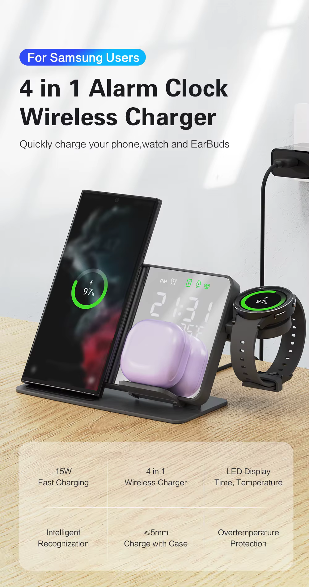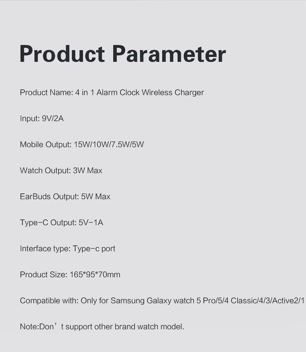 Chargez tous vos appareils : le chargeur sans fil 4-en-1 est compatible avec une large gamme d'appareils de charge sans fil activés, y compris Samsung S23 Ultra/S23+/S23/S22/22Ultra/22+/S21/S20/S10, Samsung Galaxy Buds2/Pro, Samsung Galaxy Watch5/5pro/4 Classic/4/3. iPhone 14/14 Pro / 14 Plus / 13 / 12 / 11, etc et tous les smartphones certifiés QI. • Restez informé : l'écran LED de cette petite montre numérique affiche l'heure, tandis que le capteur de température intégré affiche la température actuelle de la pièce, garantissant que vous avez toujours les informations dont vous avez besoin en un coup d'œil afin que vous puissiez créer l'environnement de sommeil parfait pour vous. • Charge comme vous le souhaitez : la charge transversale permet au chargeur sans fil de s'adapter au téléphone en position horizontale ou verticale pendant la charge. Vous pouvez ainsi regarder des films ou des vidéos sans avoir mal au cou. Vous pouvez facilement accéder aux sites Web et envoyer des messages à d'autres personnes pendant le chargement. • Tout ce dont vous avez besoin : le paquet contient une station de charge 4 en 1, un câble de charge, un adaptateur de 18 W et un manuel d'instructions (français non garanti). La station de charge sans fil est une excellente décoration de bureau, accessoire de chambre et cadeau parfait pour la famille et les amis. • Charge optimale : utilisez une prise de charge de 18 W pour une charge rapide. Nous avons inclus une prise de charge PD 18 W comme cadeau pour vous. Si vous utilisez une prise avec PD et QC3.0, utilisez uniquement le port PD pour la charge. L'utilisation des deux peut provoquer une division de la puissance et affecter les performances du chargeur.