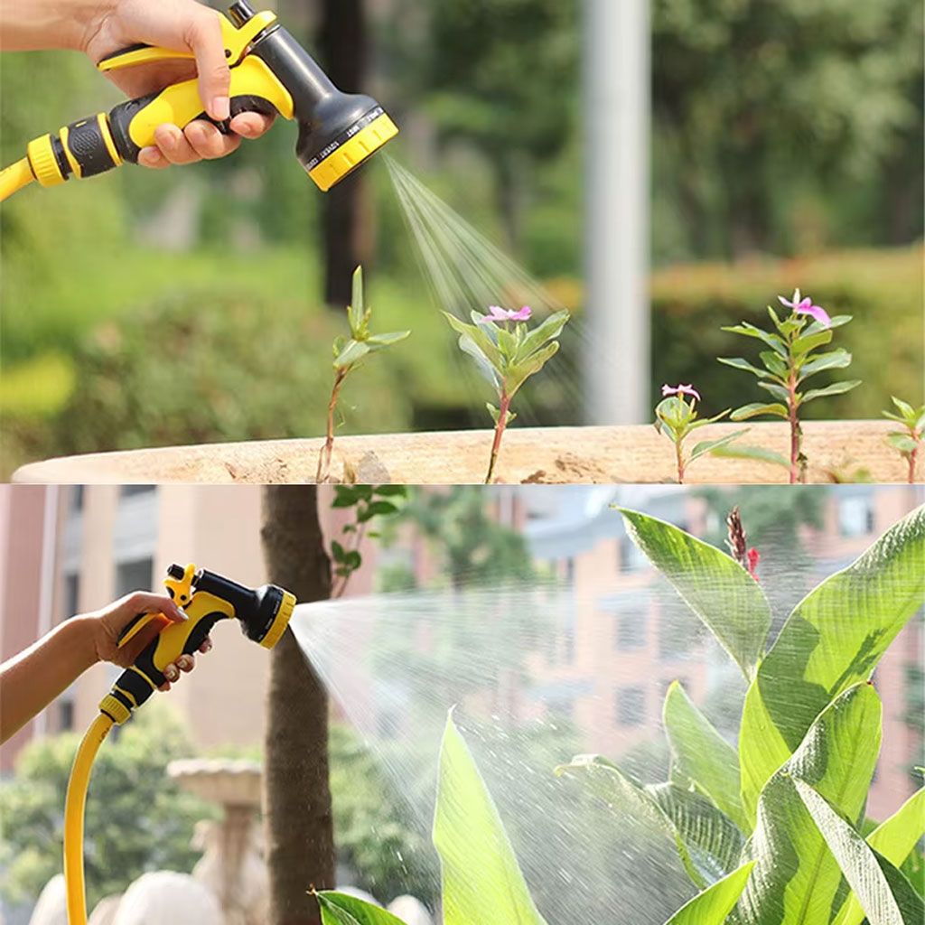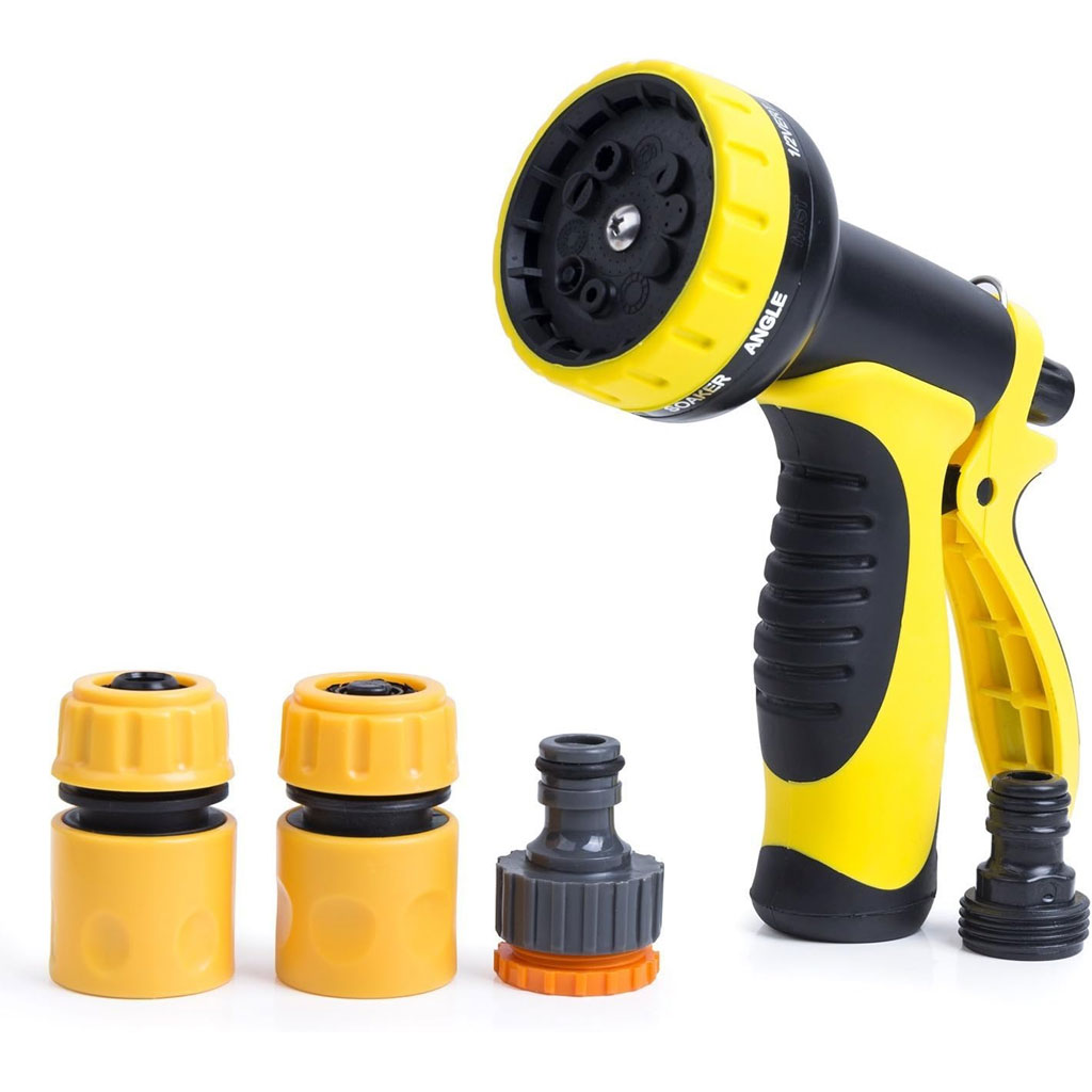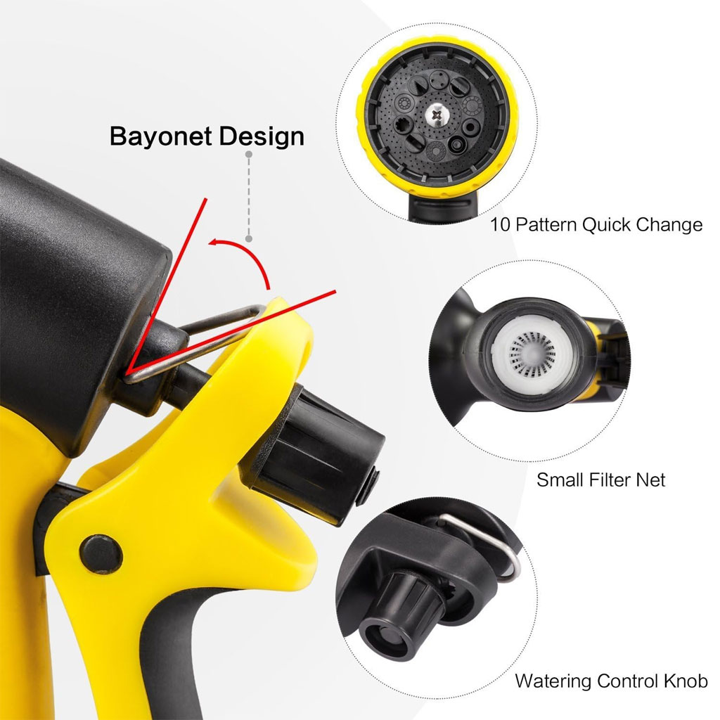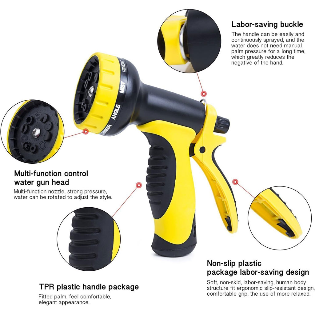 S'adapte à tous les tuyaux d'arrosage standard : notre produit est doté de connecteurs en laiton massif de 3/4". Parfait pour arroser votre jardin, votre pelouse, votre gazon et vos parterres de fleurs. Il est également idéal pour laver votre voiture, vos chiens et vos animaux de compagnie. • 9 MODES DE PULVÉRISATION - Essayez de répondre à vos besoins ! Nous innovons constamment nos produits pour vous offrir les meilleures et les plus récentes fonctionnalités adaptées à votre style de vie ! Que vous ayez besoin d'un jet haute pression pour nettoyer une surface dure ou d'une douche douce pour laver votre chien • Matériau durable : construction solide et robuste avec anneau en caoutchouc garantissant une longue durée de vie et aucune fuite. Avec un matériau léger et fiable, il tient confortablement dans la main. Comprend 3 connecteurs supplémentaires, adaptés à tous les tuyaux d'arrosage courants. • Facile à utiliser : une poignée en caoutchouc souple et une boucle à économie d'énergie rendent cette buse facile à tenir et à pulvériser librement, également parfaite pour les petites mains. La poignée du pistolet, la gâchette arrière est facile à pincer et peut être verrouillée en place avec la bague de montage incluse pour une pulvérisation continue.