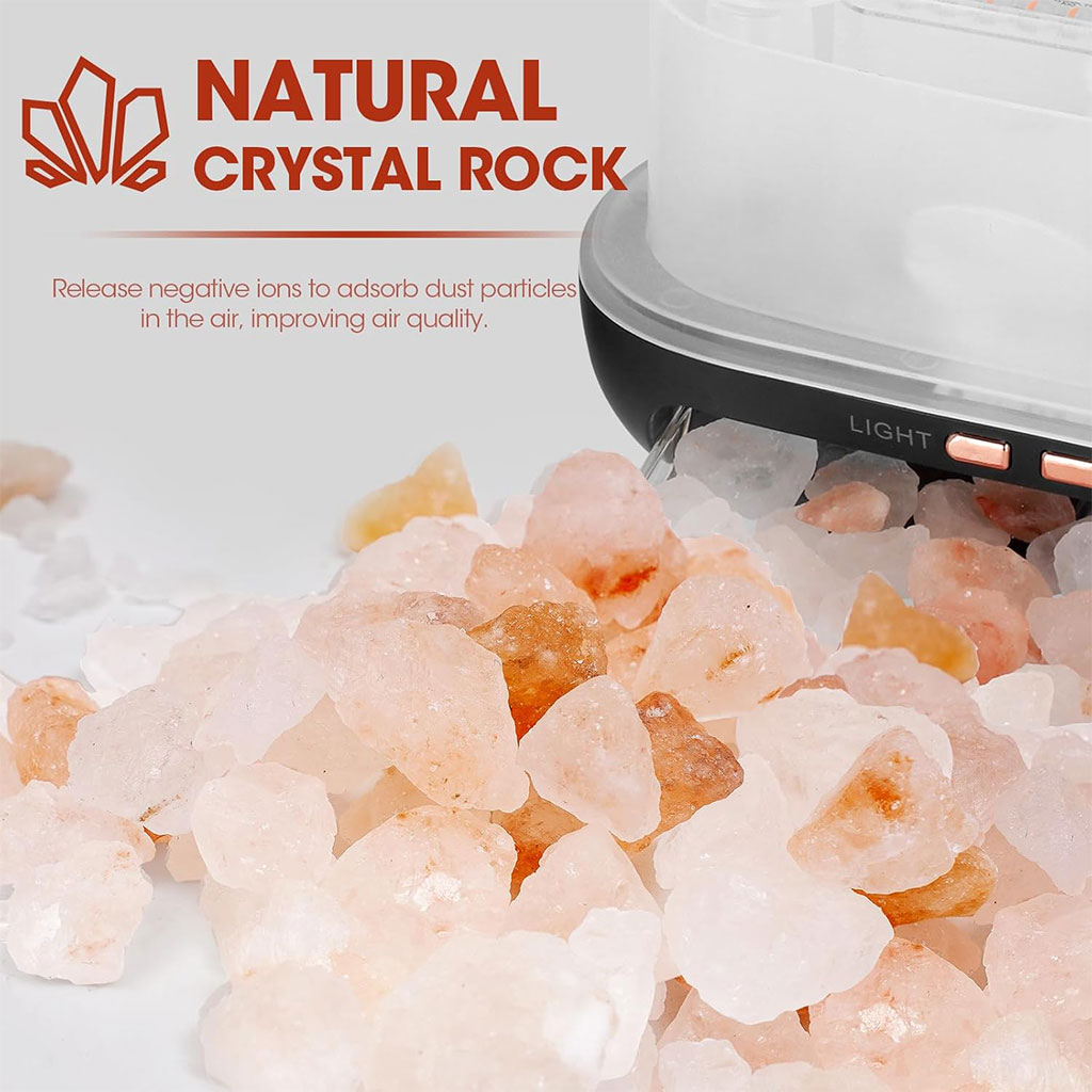 قوة ملح الهيمالايا الوردي: يأتي مع بلورات ملح الهيمالايا الطبيعية الغنية بالمعادن. عند تسخينها بلطف، تساعد على تنقية الهواء وتسهيل عملية التنفس وجذب الطاقة الإيجابية للمكان.