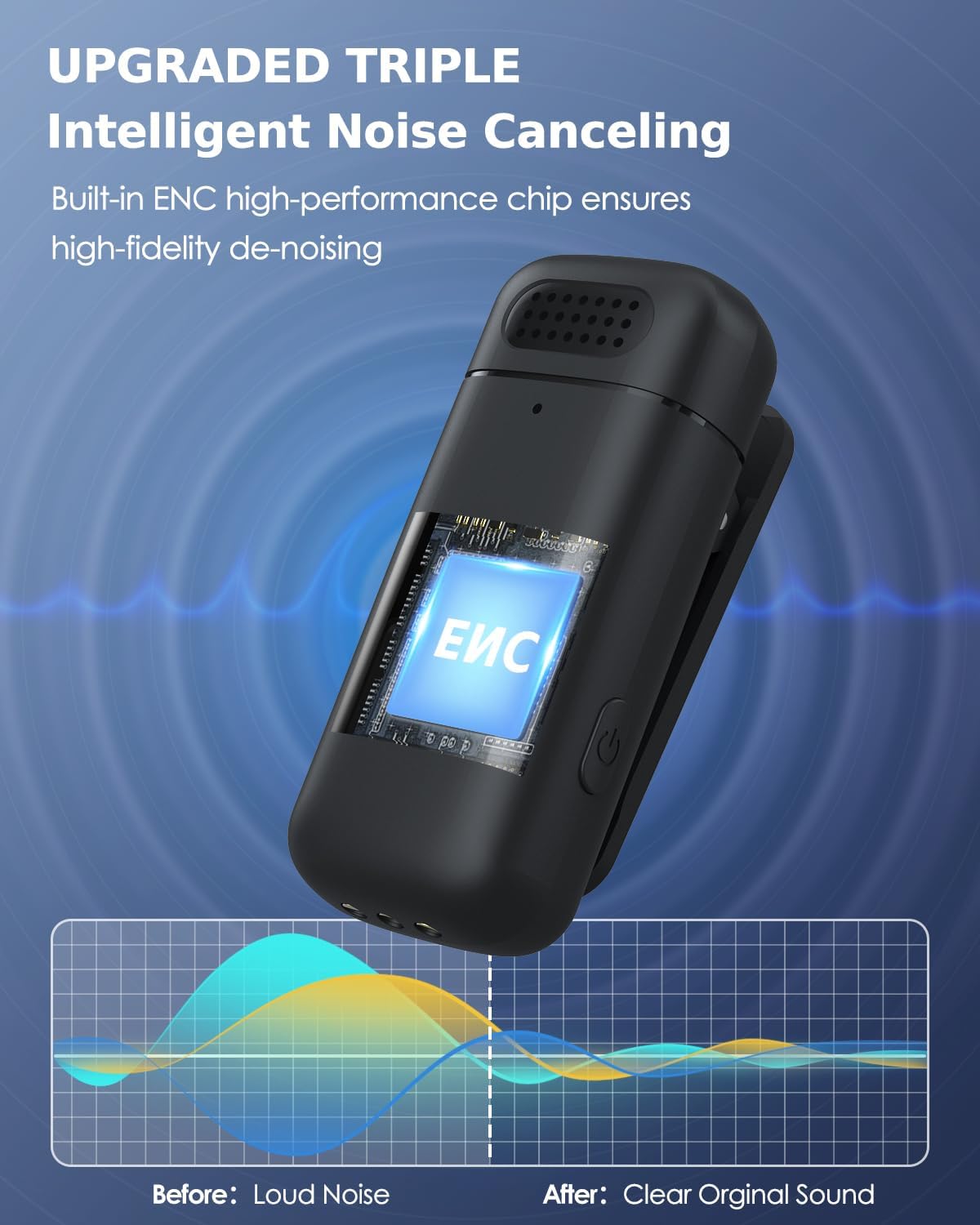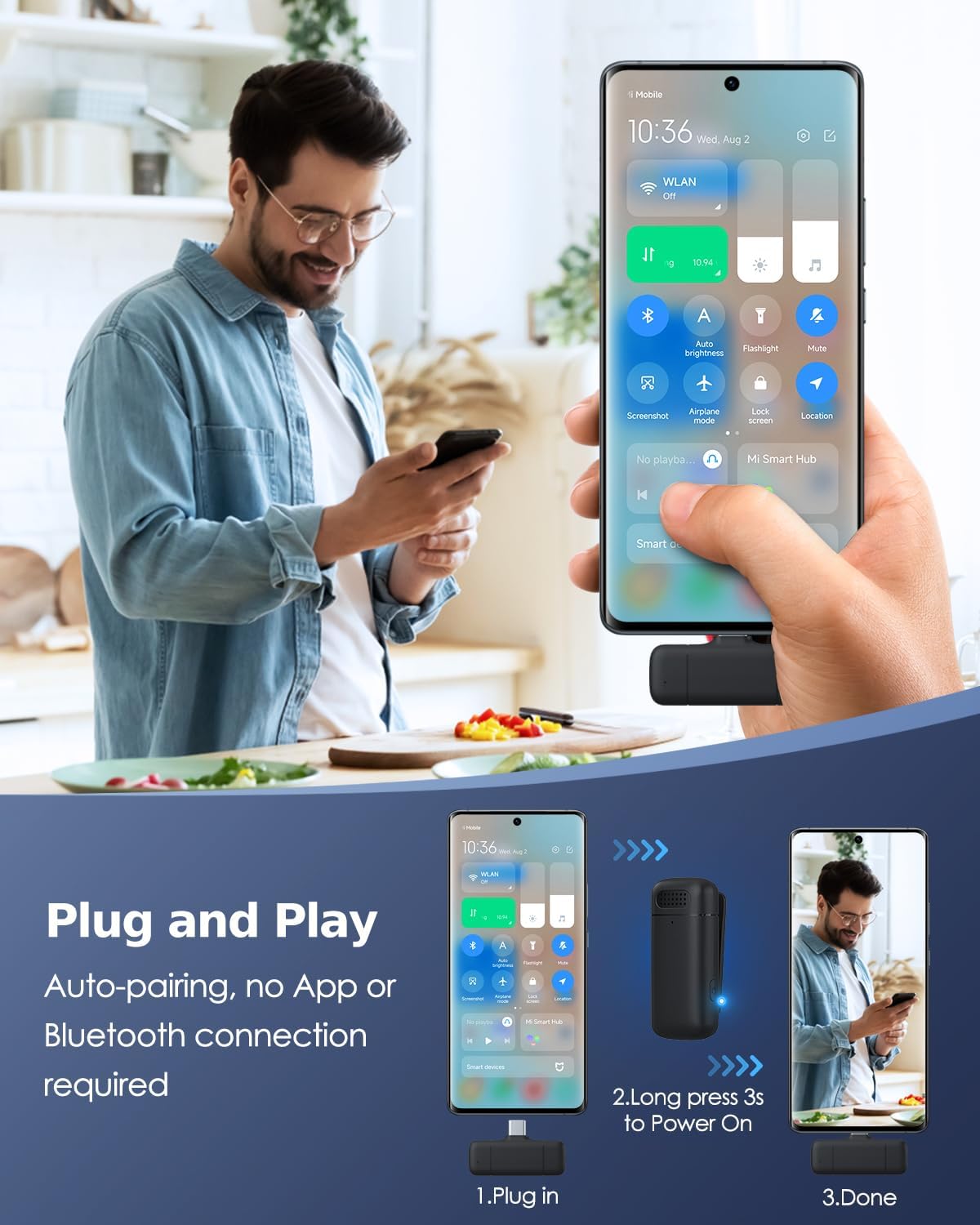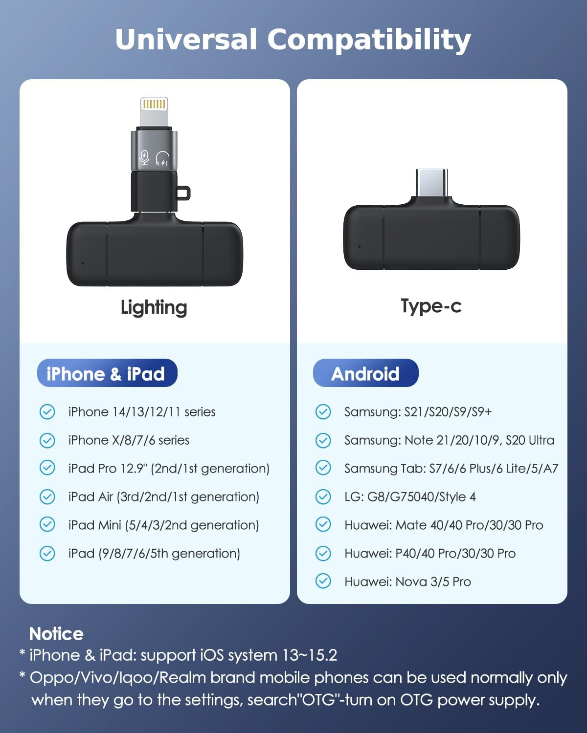 MICRO LAVALIER SANS FIL: 1 récepteur et 2 microphones sont faciles à utiliser. Il suffit de clipser le micro sans fil à votre collet, de brancher le récepteur sur votre appareil, et ils se connecteront automatiquement, aucun Bluetooth ou application requis. Livré avec un adaptateur Type-C vers Lightning, ils sont compatibles avec la plupart des téléphones iPhone et Android. Remarque: le téléphone Android s'assure que l'USB OTG dans les paramètres est activé (rechercher "OTG" - activer OTG). • COMPACT ET LÉGER: Ce microphone cravate sans fil ne pèse que 0,32 oz/10 g, ce qui est plus léger que 3 feuilles de papier A4. En même temps, 2 microphones d'enregistrement permettent à deux personnes de participer ensemble à l'enregistrement vidéo pour plus de plaisir, ce qui est parfait pour vlog, interview, diffusion en direct, YouTube, Instagram, TikTok, blog, enregistrement vidéo Twitter, etc. (La connexion à l'ordinateur et à l'appareil photo n'est pas recommandée.) • ÉTUI DE CHARGE LONGUE DURÉE: Le microphone sans fil mis à jour contient un étui de charge pour ranger le microphone et le récepteur, ainsi qu'un endroit pour charger le microphone. La boîte de rangement entièrement chargée peut charger 2 microphones 3 à 4 fois en même temps et chaque microphone peut fonctionner pendant environ 6 heures par charge. Sa conception légère vous permet de l'emporter partout (seulement 2,24 oz/63,5 g). • TRIPLE RÉDUCTION DU BRUIT: Adoptant la puce de réduction du bruit ENC de pointe, lorsque le mini microphone lavalier est activé, le mode triple réduction du bruit est automatiquement activé, ce qui peut minimiser le bruit ambiant et garder la voix claire et haute fidélité même au milieu des perturbations sonores à l'extérieur. Sa technologie de synchronisation en temps réel peut synchroniser l'entrée vocale, améliorer la qualité vidéo et réduire le temps de post-édition vidéo. • PORTÉE DE TRANSMISSION JUSQU'À 20m: Le mini-micro-cravate prend en charge jusqu'à 20 m de distance de travail de réception audio haute fidélité stable et fiable dans un espace ouvert et dégagé, ce qui vous permet d'enregistrer plus facilement dans des environnements complexes. (Remarque: Lorsqu'il y a un obstacle physique entre l'émetteur et le récepteur, le signal sera dégradé ou coupé). • CONTENU DU COLIS: Le colis comprend 2 mini microphones sans fil, 1 étui de chargement, 1 récepteur de Type C, 1 adaptateur de Type C vers Lightning, 2 câbles de charge de Type C