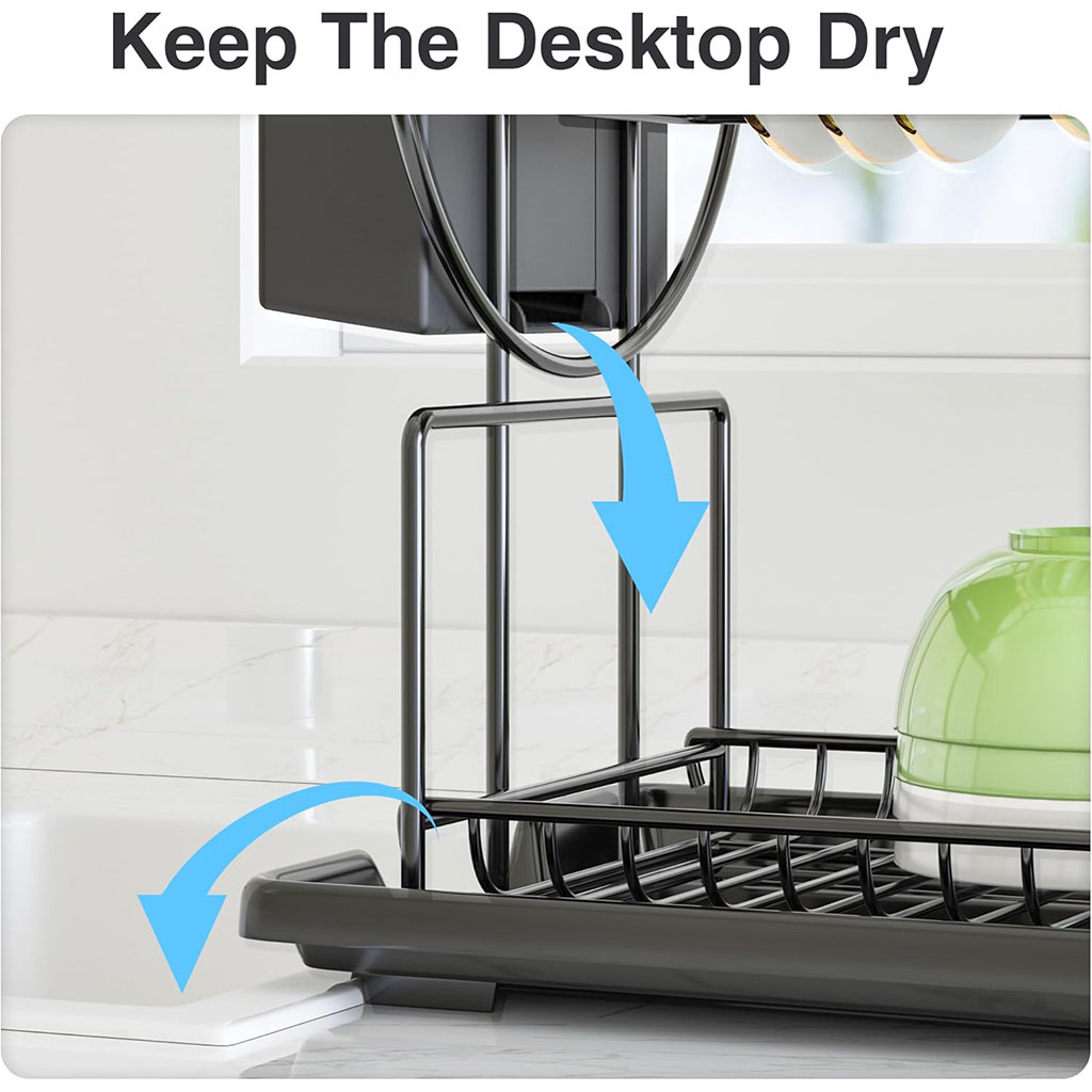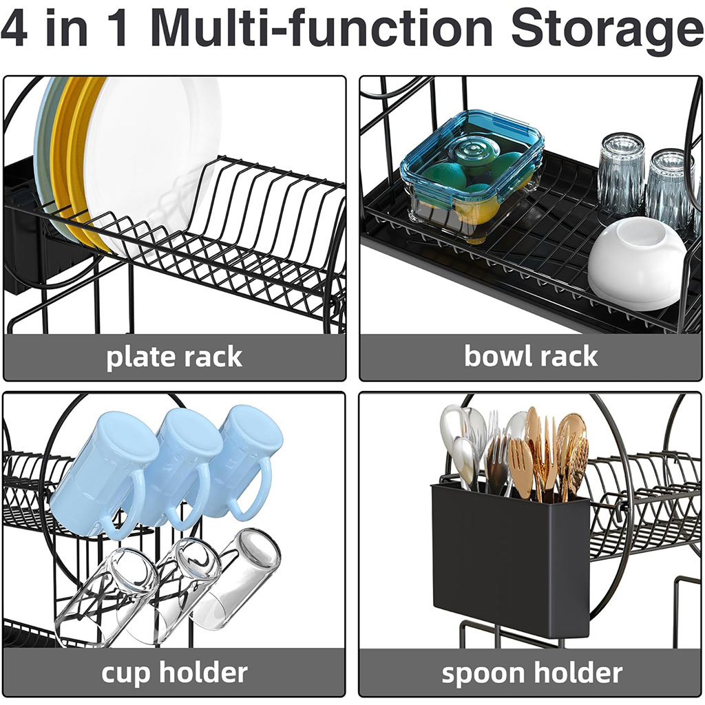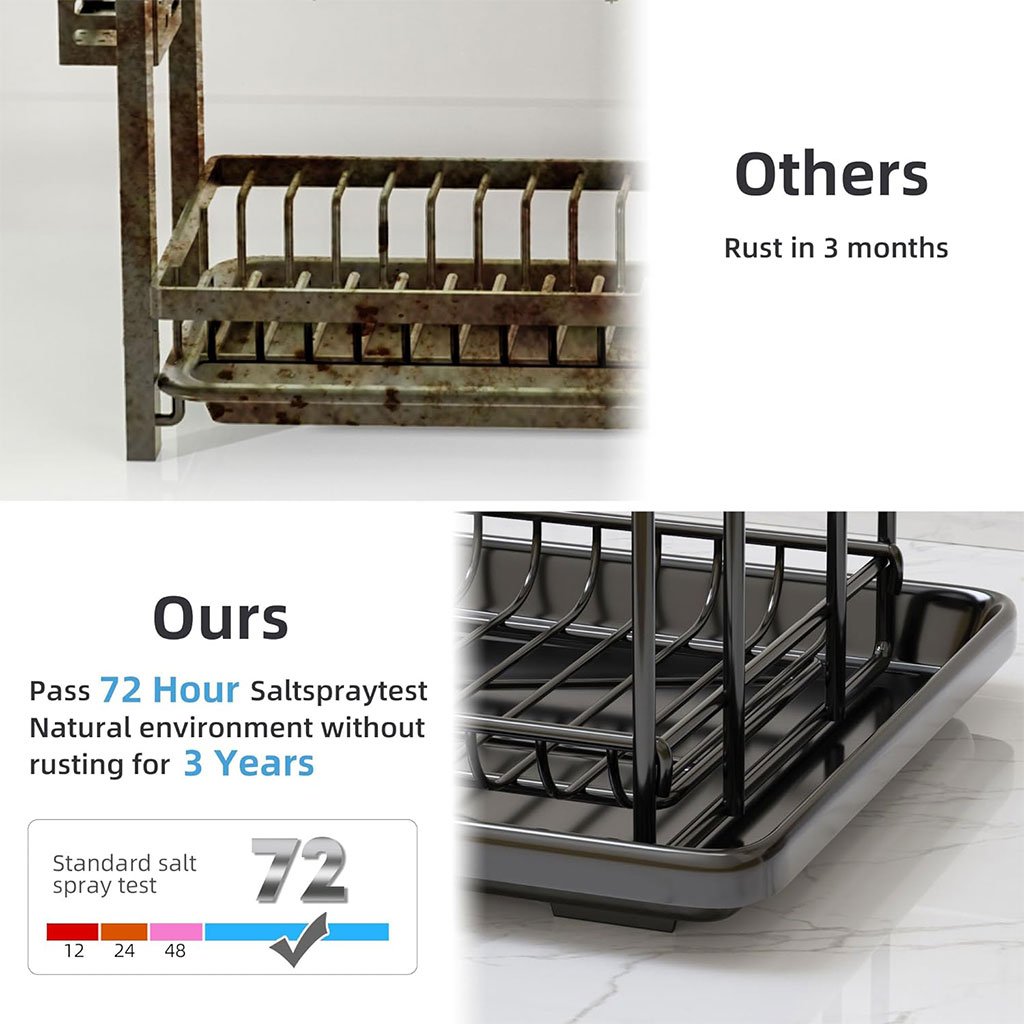 【Test au brouillard salin de 72 heures réussi】 La technologie de galvanoplastie résout le problème de la rouille sur l'egoutoire vaisselle cuisine noire. A passé le test au brouillard salin de 72 heures et 14 est durable et sans rouille même dans les environnements humides. • 【Accessoires complets】 Il s'agit d'un égoûtoir à vaisselle multifonction 3 en 1 en inox équipé d'un porte-gobelet et d'un porte-ustensiles. L'égoûtoir vaisselle inox peut contenir presque tous les ustensiles de cuisine et a la fonction d'égouttage. • 【Gardez le comptoir propre et bien rangé】 L'escurre platos a une fonction de drainage automatique, qui peut garder le comptoir propre et sec, et l'égouttoir lui-même n'accumulera pas d'eau. • 【Construction sans vis】Facile à installer sans vis requise ! Et la structure est simple et facile à nettoyer.