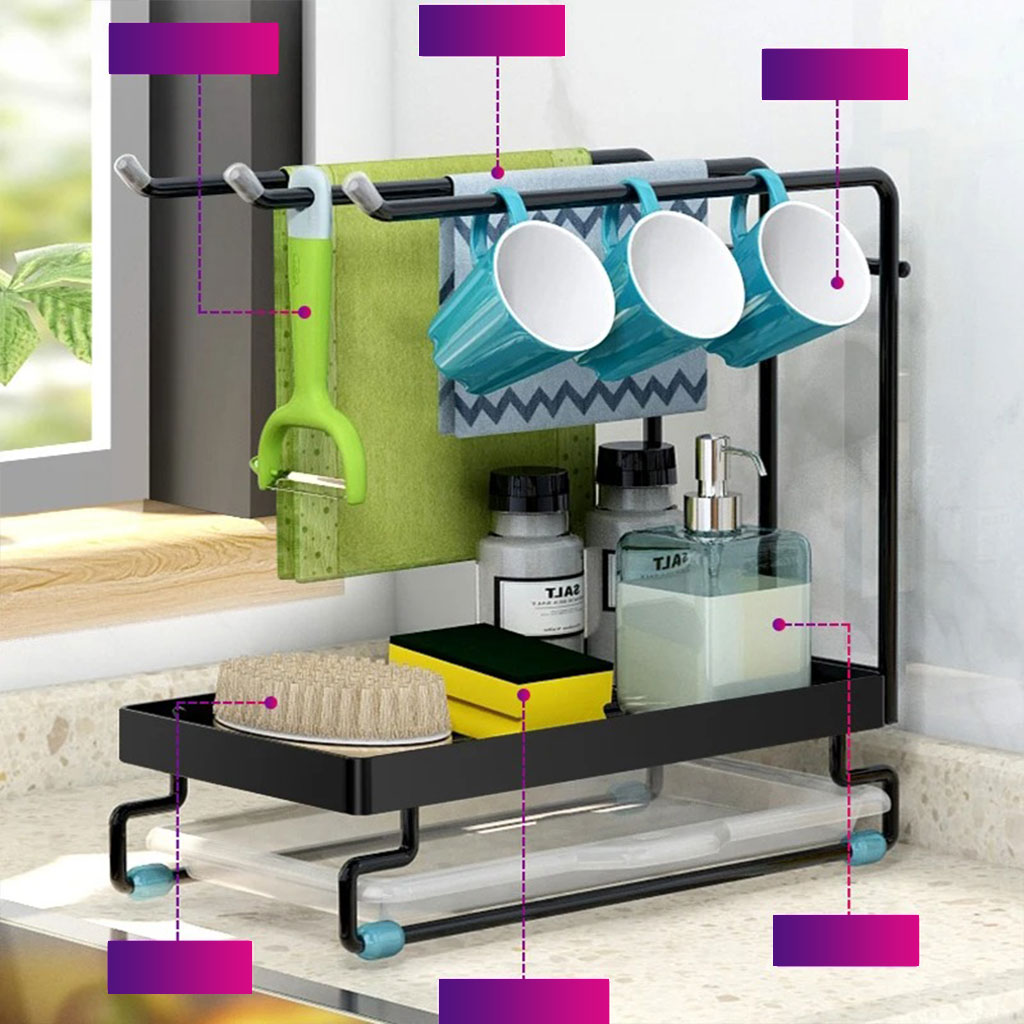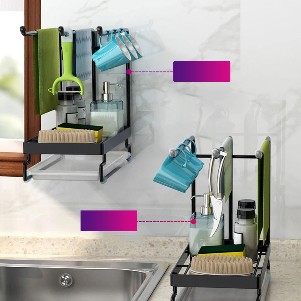 سعة تخزين ذكية: مساحة واسعة تستوعب الإسفنج، الفرش، الصابون السائل، وسوائل تنظيف الأطباق في مكان واحد، مما يوفر لك مساحة أكبر داخل الحوض وعلى "البان دو ترافاي".