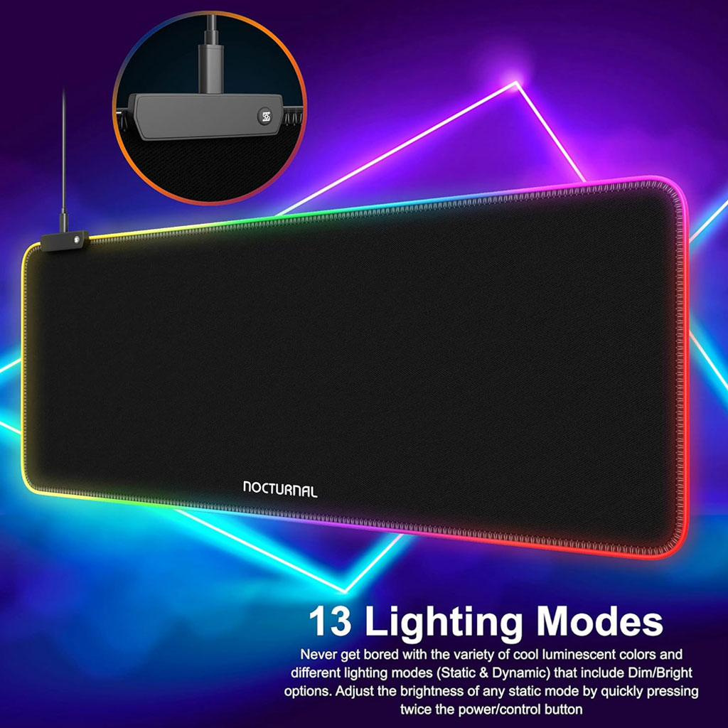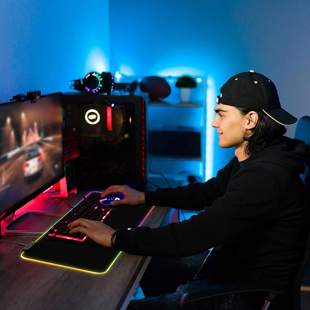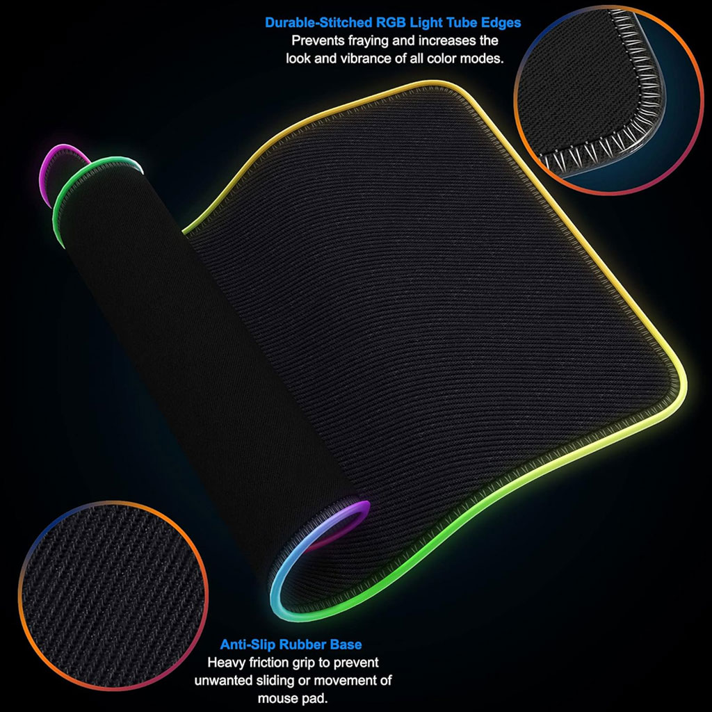 Tapis de souris ultra-large au design ergonomique • Surface lisse pour un contrôle précis de la souris • Base en caoutchouc antidérapante pour une prise ferme • Facile à installer sans aucun pilote requis • Effets d'éclairage RVB avec plusieurs modes et niveaux