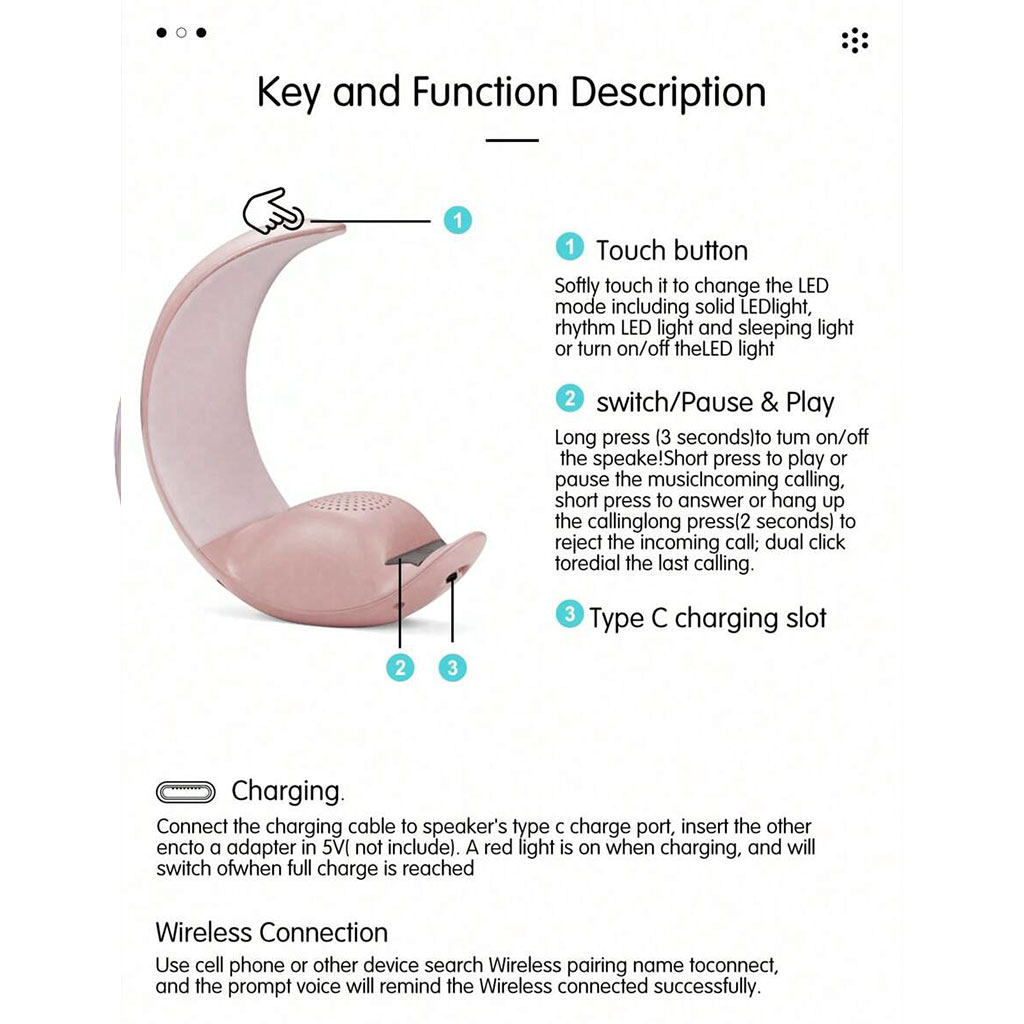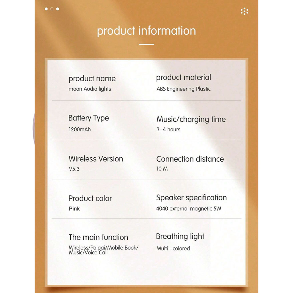 Découvrez la Moon Lamp Touch Speaker , une innovation technologique qui combine esthétique et fonctionnalité pour transformer votre espace. Caractéristiques principales : • Connectivité sans fil : Connectez-vous facilement à votre smartphone ou tout autre appareil compatible Bluetooth pour écouter votre musique préférée sans contrainte de câbles. • Son de haute qualité : Profitez d'un son clair et riche grâce à ses haut-parleurs intégrés qui garantissent une expérience audio immersive. • Éclairage d'ambiance : Créez l'atmosphère parfaite avec une lumière d'ambiance douce qui imite l'apparence apaisante de la lune. Idéale pour les soirées relaxantes ou comme veilleuse dans votre chambre. • Fonction appel vocal : Répondez à vos appels directement depuis la lampe grâce à sa fonction de commande vocale intégrée, vous permettant de rester connecté sans effort. • Batterie intégrée de 1200 mAh : Avec une autonomie de lecture de 3 à 5 heures, profitez de votre musique et de votre éclairage sans interruption. • Contrôle tactile : Ajustez la lumière et le volume de votre musique en toute simplicité grâce à la fonction tactile intuitive.