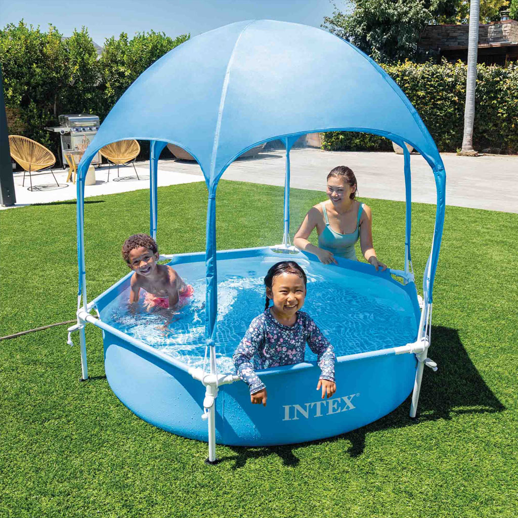 Dimensions une fois assemblé : env. 1,83 mx 38 cm • Capacité en eau (80%) : 700L • Auvent facile à installer ; le pulvérisateur intégré garde les enfants au frais • Prêt pour l'eau en 10 minutes • À partir de 3 ans