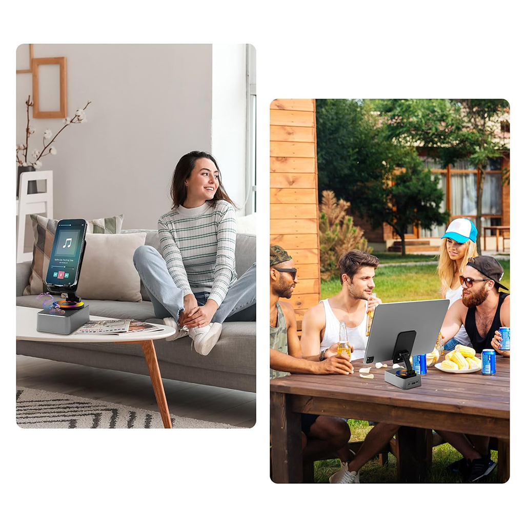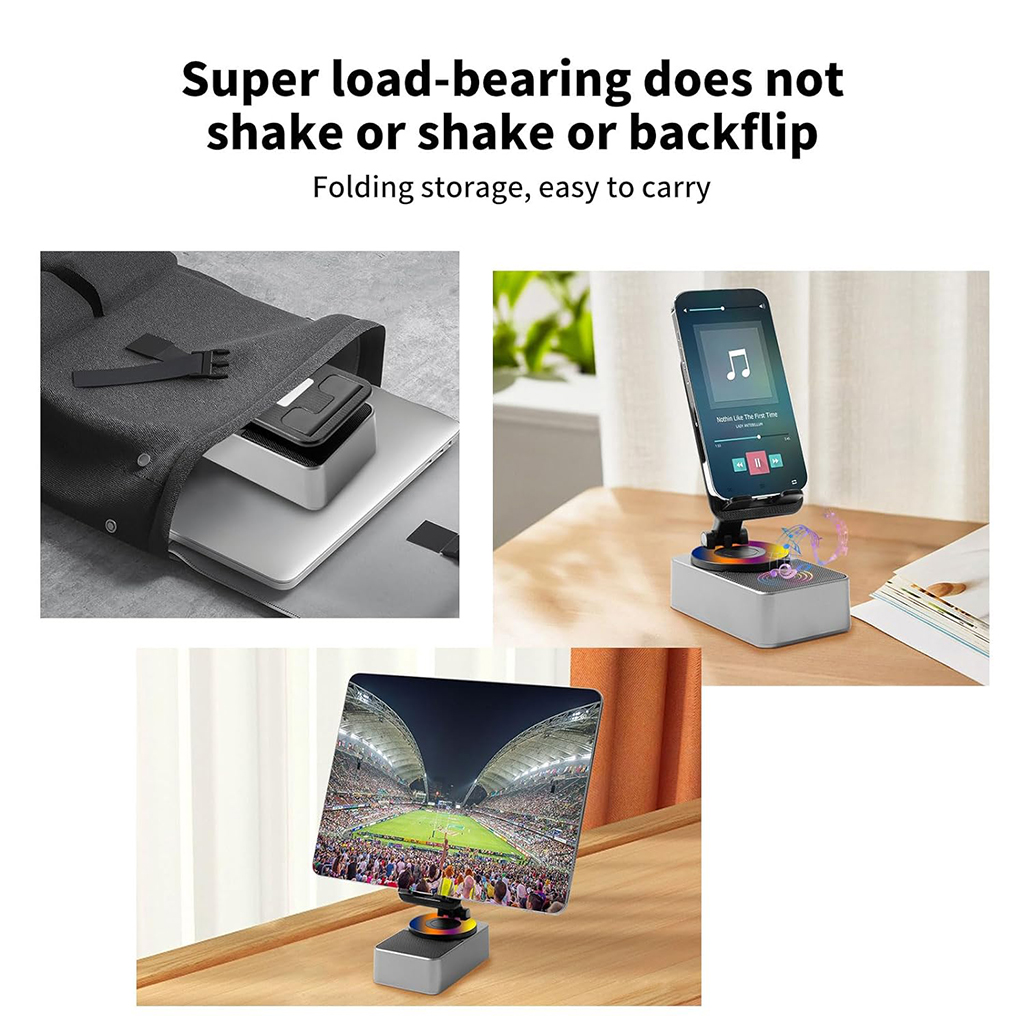 Cadeau créatif multifonctionnel : ce gadget multifonctionnel comprend un haut-parleur Bluetooth, un support pour téléphone portable, un microphone intégré, une batterie rechargeable intégrée de 1 500 mAh et une lumière ambiante LED colorée. Avec sa fonctionnalité puissante et son design attrayant, c'est un compagnon idéal pour que votre téléphone écoute de la musique, regarde des films, la télévision ou assiste à des cours en ligne, et un cadeau créatif idéal pour la famille ou les amis. Haut-parleur Bluetooth portable : doté de la technologie Bluetooth 5.0, il offre une consommation d'énergie réduite, une transmission plus rapide et un signal plus stable avec une latence nulle. Le grand diaphragme de basse éclairé indépendant de 1,7 pouce en bas offre un son plus clair avec des basses puissantes et une stéréo hi-fi , offrant des performances audio étonnantes à n'importe quel volume.Amplification des basses, médiums compacts et aigus clairs sans distorsion.Découvrez le son d'une salle de concert, plongez-vous dans un superbe festin auditif à 360 ° de bonne musique.De plus, le haut-parleur est équipé d'un microphone pour les appels Bluetooth. Support de téléphone portable : aucune installation requise, facile à utiliser, conception à double roulement, hauteur réglable, angle réglable de 0° à 180°, pliable et facile à transporter. Le nouvel axe AR peut être tourné à 360°, est robuste sans oscillation. et produit un son de décompression à cliquet stéréo lors de la rotation. Des coussinets antidérapants en silicone sur le support de téléphone et la base assurent la stabilité du téléphone et du support sur la table. Conçu avec un port de chargement, ce qui facilite le chargement de votre téléphone. lors de l'utilisation de ce produit. Batterie rechargeable haute capacité intégrée : la batterie intégrée de 1 500 mAh offre des performances puissantes et durables, prenant en charge jusqu'à 8 heures d'utilisation continue du haut-parleur Bluetooth. Elle est livrée avec des ports d'alimentation, USB et Type-C à l'arrière. .Les ports de type C peuvent être utilisés pour charger la batterie intégrée, permettant à la batterie d'être complètement chargée en 1,5 heure environ. La batterie peut également servir de source d'alimentation pour votre téléphone mobile ou votre tablette en cas de besoin. Que vous utilisiez ce gadget sympa à la maison, dans la cuisine, à l'extérieur ou au bureau, il améliorera votre expérience. Le forfait comprend : le produit, un câble de chargement de type C et un manuel d'instructions. Avant d'utiliser ce haut-parleur Bluetooth sans fil, veuillez le connecter à une source d'alimentation à l'aide du câble de type C pour le charger. Ce support pour iPhone convient à la plupart des 4-13 ans. Smartphones, tablettes et liseuses de pouces tels que iPhone 14 Pro/14/iPhone 13 Pro Max/13 Pro/13/iPhone 12 Pro Max/12 Pro/11/Xs Max/Xs/XR/X/8 7 6 6s Plus 5 5s SE, Galaxy S9/S9 Plus/S8/S7/S6/Note9/Note 8, LG, IPAD mini et Samsung Tab. Ce produit est livré avec une garantie gratuite de 2 ans.