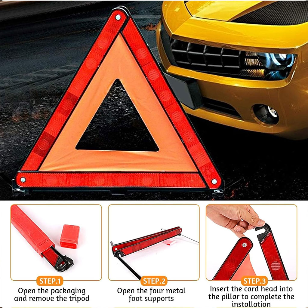 تصميم عملي وقابل للطي: المثلث سهل الفتح والطي، ويأتي مع حافظة صغيرة لا تشغل مساحة في صندوق السيارة، مما يجعله دائماً جاهزاً للاستخدام.
