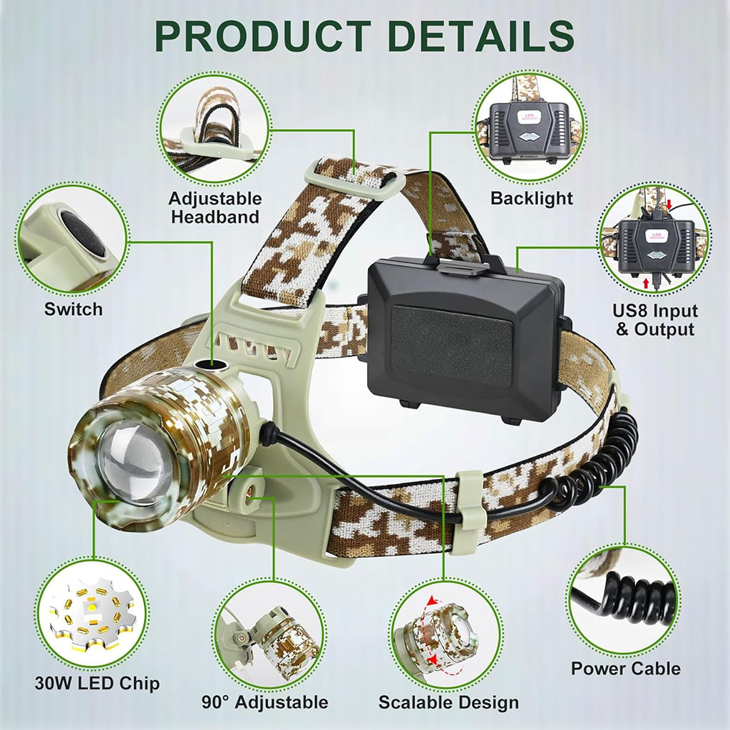 Lampe Frontale LED Motif Camouflage Rechargeable