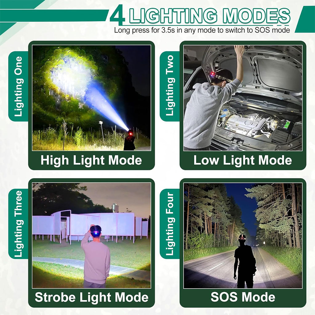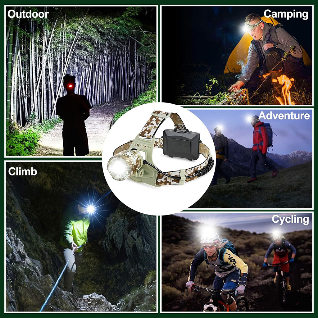Léger : le phare ne pèse que la lumière, vous pouvez donc sentir la tête sans pression, vous vous sentirez très détendu. peut protéger vos phares de tous les angles d'éclaboussures, vous ne vous inquiétez pas de la pluie. • Modes : lumière blanche : pleine luminosité, demi-luminosité et mode induction ; pleine luminosité et clignotant. La lumière blanche et la lumière rouge sont contrôlées par un interrupteur différent. • Rotatif : le phare monté sur la tête est réglable, peut s'adapter à n'importe quelle forme de tête ou casque, il est léger et confortable, parfait pour la course de nuit, rend vos mains libres, et il est largement adapté pour la marche, le camping, la lecture, la pêche. • plage de luminosité : vous offre une plage de luminosité allant jusqu'à une distance de pieds, vous permettant de voir clairement l'environnement environnant pour vous assurer de rester à l'écart du danger. • Lorsque vous travaillez de près ou si vous souhaitez vous concentrer sur un objet spécifique, vous pouvez projeter un projecteur lumineux. et vous transformez facilement tout votre faisceau en un projecteur large idéal pour l'éclairage.