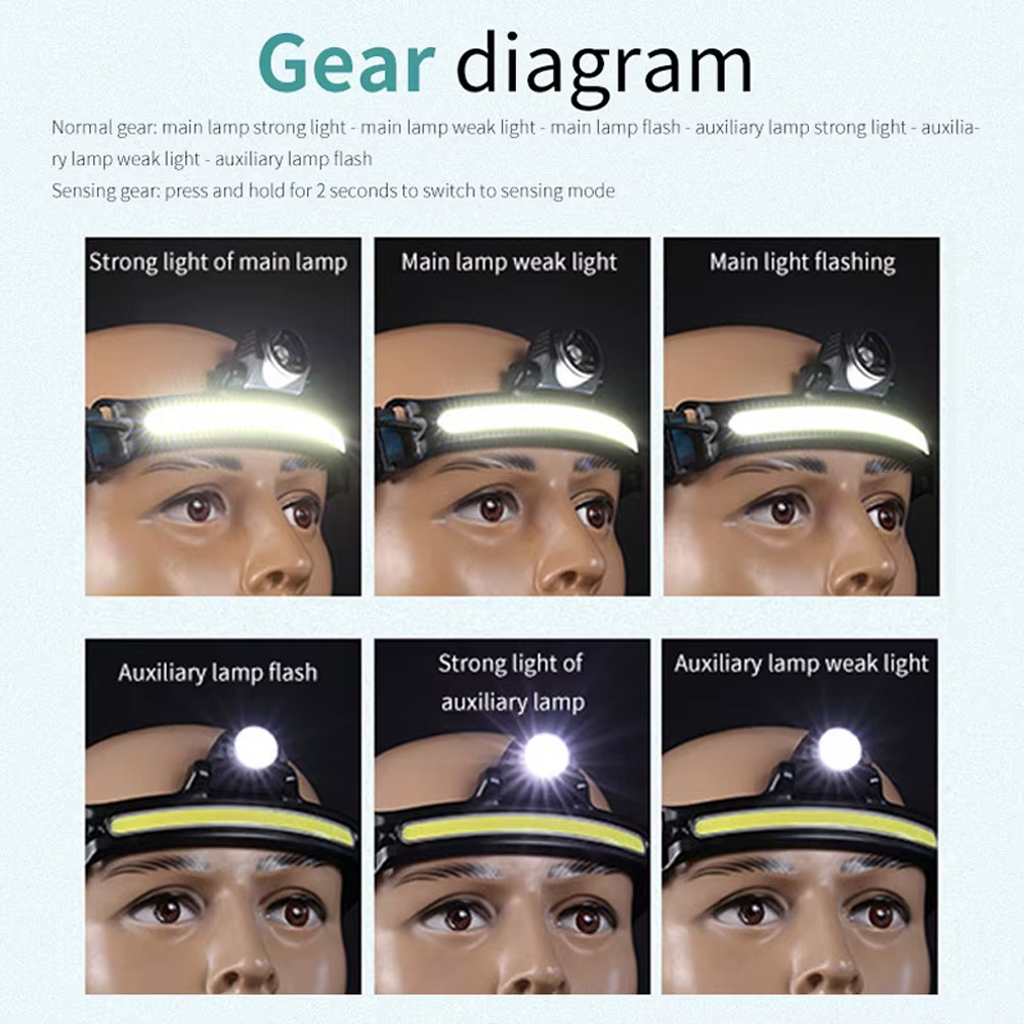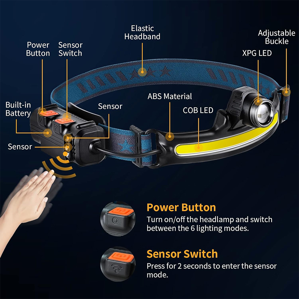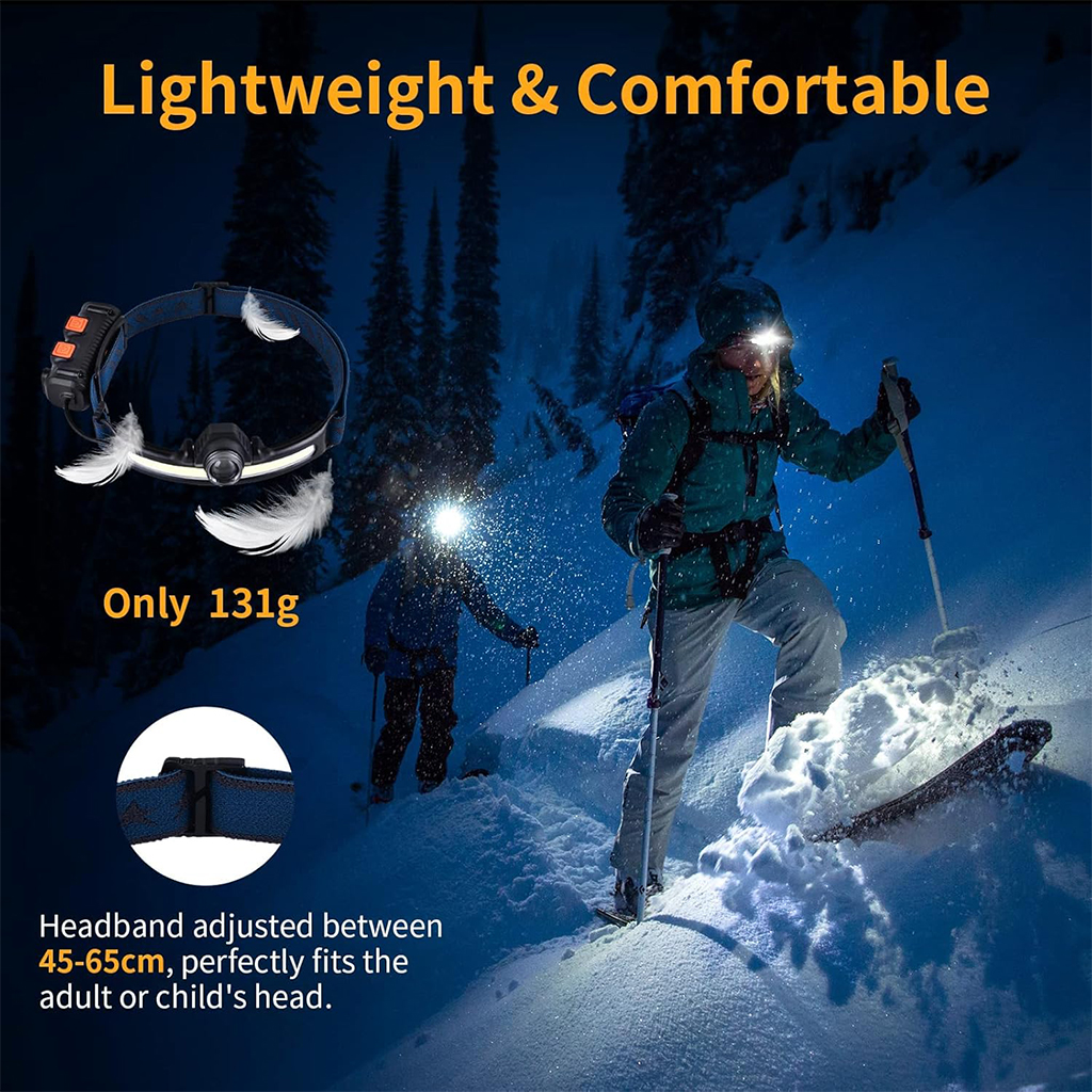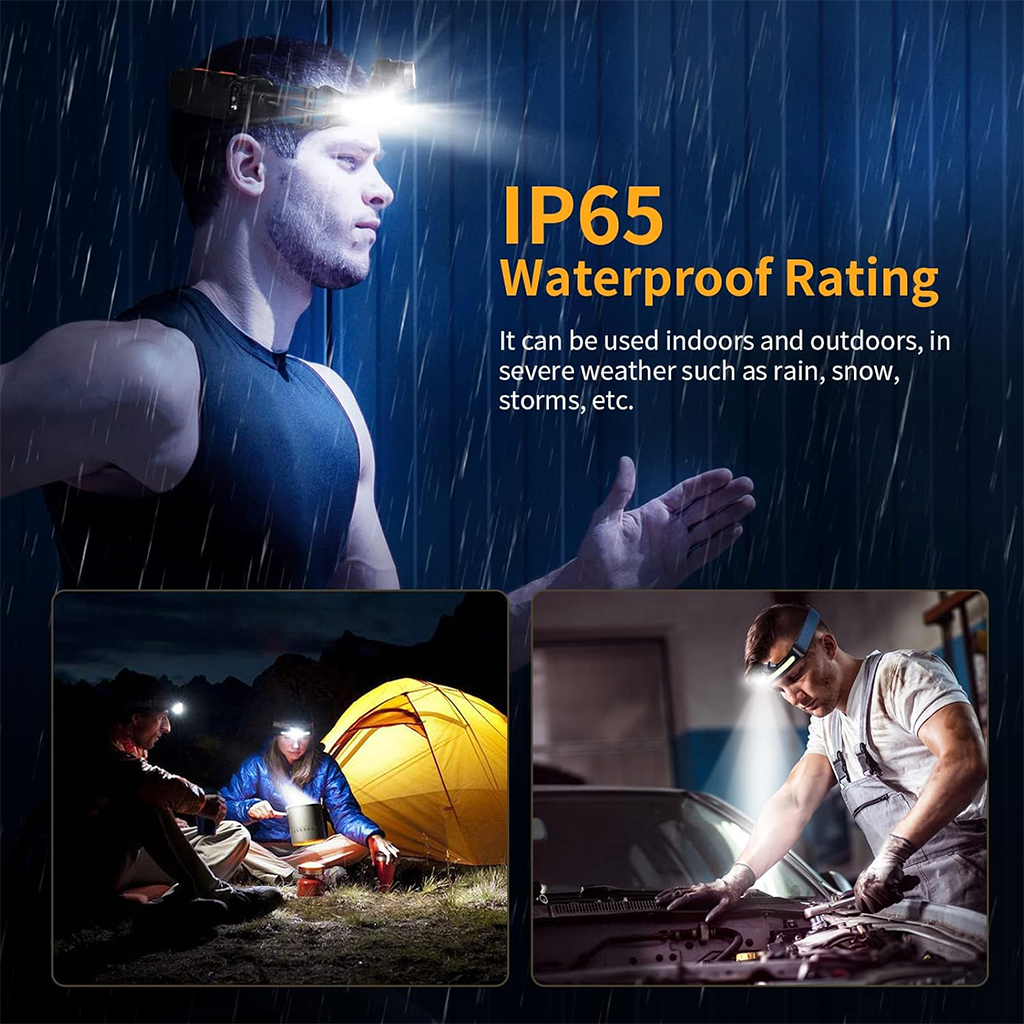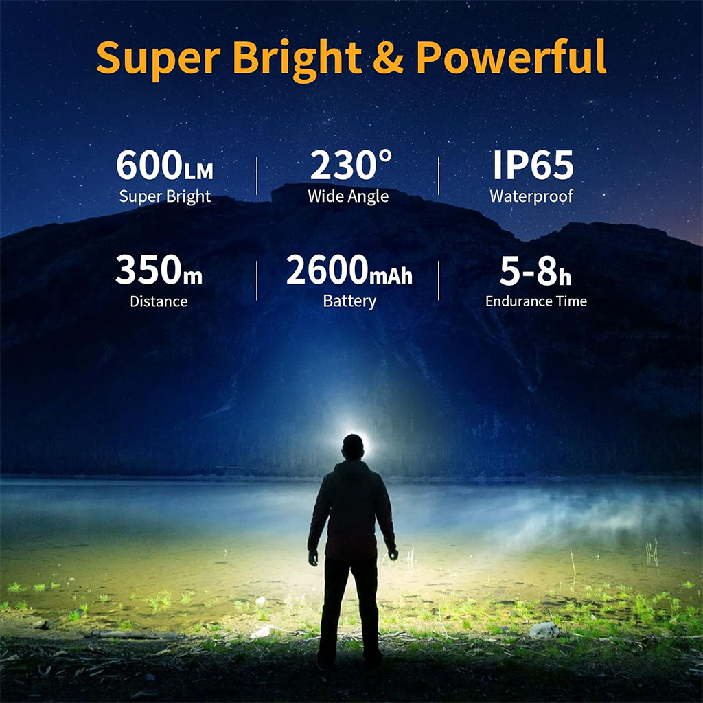 【6 modes d'éclairage】 Notre lampe frontale adopte des sources lumineuses, torche LED et bande LED, équipées de perles de lampe LED de haute qualité, la luminosité la plus élevée atteint 600LM, la source de lumière est stable et durable. Il dispose de 6 modes d'éclairage : Lumière de bande puissante / faible / clignotante et Lumière de torche puissante / faible / clignotante pour répondre à vos besoins d'éclairage dans différents environnements. • 【Capteur de mouvement】Capteur infrarouge intégré de haute qualité, après avoir allumé l'interrupteur du capteur, vous pouvez changer le mode d'éclairage et allumer/éteindre la lampe en agitant la main à une certaine distance devant le capteur de mouvement. Vous n'avez pas besoin de le tenir d'une main comme une lampe de poche, vous pouvez le porter sur votre tête et utiliser les deux mains librement, ce qui est très pratique. • 【Zoom réglable, grand angle de 230°】 La bande LED peut atteindre un éclairage grand angle de 230°. L'angle supérieur et inférieur de la torche LED peut être ajusté de 135° et la distance d'éclairage peut atteindre 350 m. Il peut non seulement éclairer les pieds, mais également éclairer largement l'environnement environnant, et il n'y a pas d'angle mort dans l'éclairage pour éviter tout danger potentiel. • 【Rechargeable USB, indicateur de puissance restante】 Batterie au lithium haute capacité intégrée de 2600 mAh, avec câble de charge Tpye-C, charge rapide en 3-4 heures. Lorsqu'il est complètement chargé, il peut être utilisé pendant environ 5h-8h selon le mode d'éclairage. Vous pouvez facilement connaître la puissance restante grâce à l'indicateur d'affichage de la batterie, ce qui vous permet de mieux utiliser la lampe frontale. • 【Léger, taille réglable】 Le bandeau de la lampe est élastique et réglable, ne pesant que 131 grammes, compact et portable, confortable à porter, durable et difficile à tomber. La taille de la circonférence de la tête peut être ajustée librement entre 45 cm et 65 cm pour s'adapter parfaitement à la tête et au casque de sécurité de l'adulte ou de l'enfant. • 【Étanche IP65, largement utilisé】 La lampe frontale a un indice d'étanchéité IP65. La coque en ABS de haute qualité est plus étanche et peut être utilisée à l'intérieur et à l'extérieur. Convient pour le camping, le vélo, la course, la marche nocturne, l'alpinisme, la pêche, la chasse, la lecture, la réparation automobile, le bricolage ou toute situation d'urgence, comme un incendie, un ouragan, la neige, une tempête, une panne de courant.