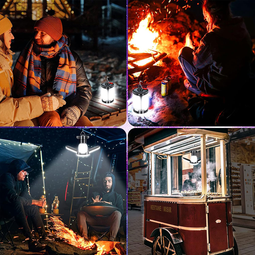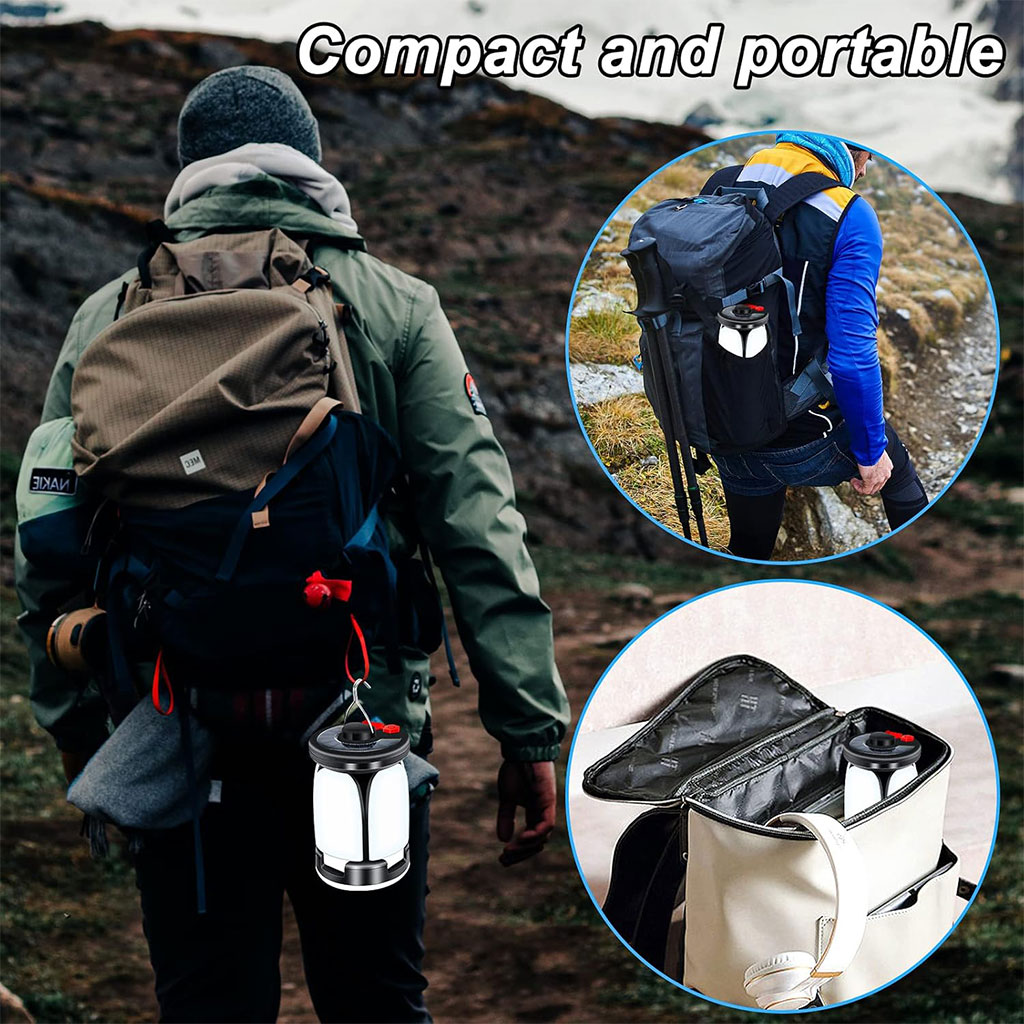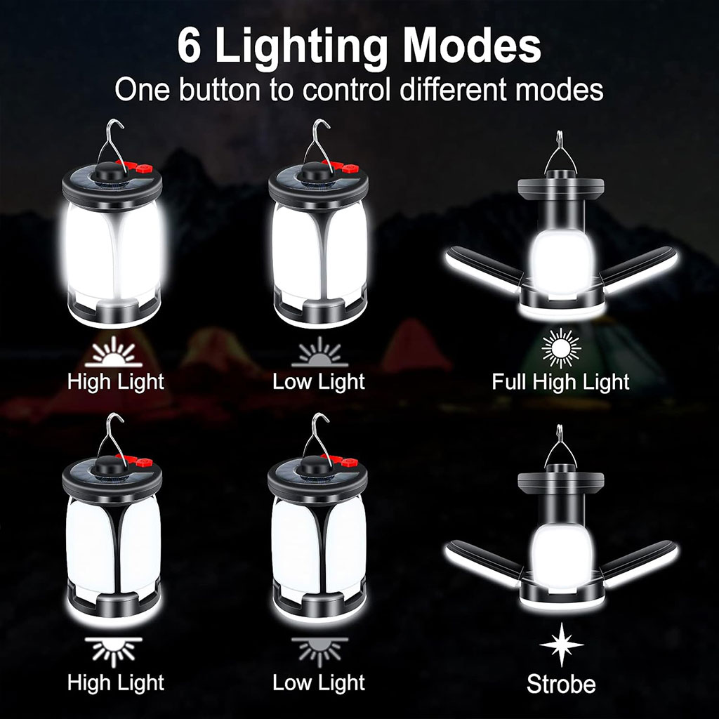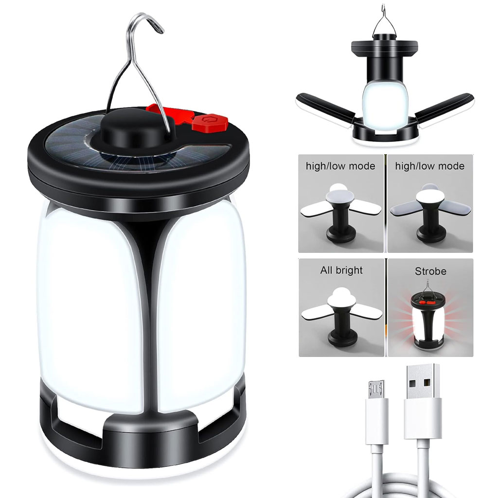 modes d'éclairage : cette lampe de camping à LED dispose de 60 LED de haute qualité et avec 6 modes au choix, vous pouvez choisir différents modes d'éclairage en fonction de différents scénarios d'utilisation, des changements en un clic pour répondre pleinement à vos besoins. • Rechargeable par USB et solaire : la batterie rechargeable intégrée de 3600 mAh peut durer jusqu'à 10 heures avec une charge complète. Chargement USB ou solaire, plus économe en énergie et respectueux de l'environnement. • Lampe de camping multifonctionnelle : cette lanterne de camping peut être utilisée comme lampe de camping portable, dépliez toutes les lumières latérales et utilisez les crochets en haut, elles peuvent être utilisées comme petites lampes suspendues qui peuvent être accrochées au-dessus de la tente pour éclairer une plus grande zone. • Portable et fiable : cette lampe de camping est très pratique et peu encombrante, elle peut être facilement mise dans votre sac à dos et commencer votre voyage à tout moment. IPX4 étanche, c'est le meilleur choix pour le camping, la pêche, les activités de plein air, la randonnée, l'entretien de la voiture, etc. Il peut également être utilisé comme éclairage de secours. • Conception de banque d'alimentation : cette lampe de camping peut non seulement être utilisée pour un éclairage polyvalent, mais également comme banque d'alimentation pour charger votre téléphone, facilitant ainsi vos activités de plein air !