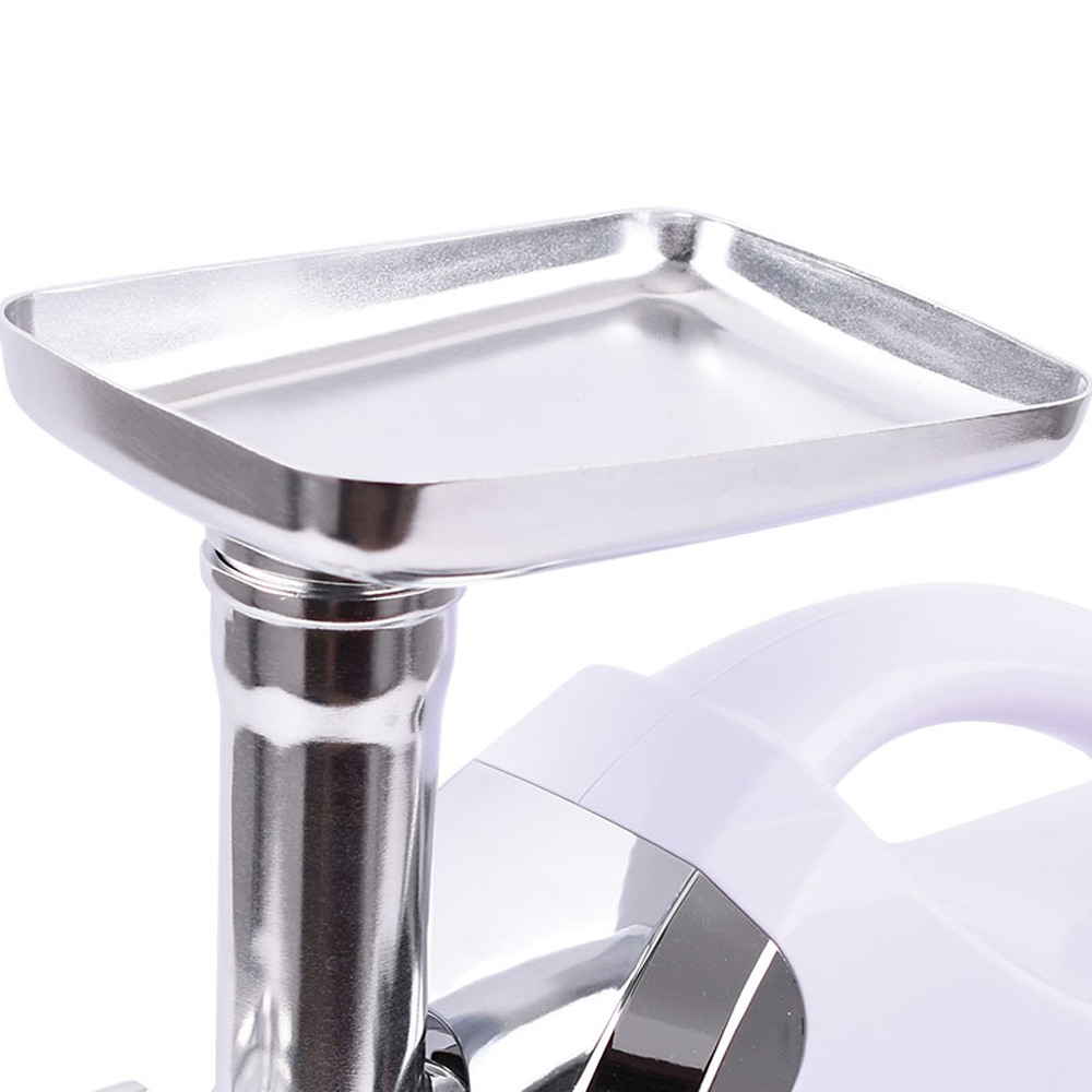 Hachoir à viande • 220-240V.50 / 60Hz • puissance max: 1000W • Fonction marche / arrêt et marche arrière • Moteur entièrement en cuivre • Plateau de nourriture amovible en métal • Lame en acier inoxydable • 3 disques de coupe en métal (3 mm, 5 mm, 7 mm) • Tube de farce à saucisses • Attachement Kibbe