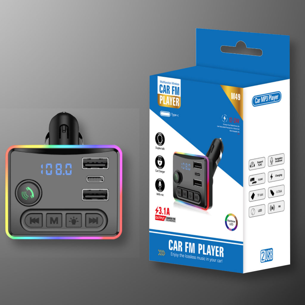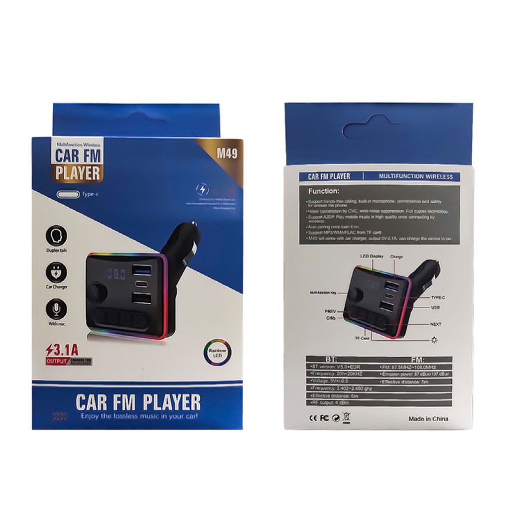 Bluetooth 5.0 : Offre une connexion rapide et stable avec une portée étendue. Le Bluetooth 5.0 garantit une faible latence et une transmission efficace du son, assurant une meilleure qualité audio sans perte. Compatible avec la plupart des smartphones, tablettes et autres appareils Bluetooth. • Qualité sonore sans perte : Le M49 est conçu pour offrir un son clair et riche sans compression, permettant de profiter pleinement de votre musique avec des basses profondes, des médiums précis et des aigus cristallins. La qualité sonore est optimisée même pour les audiophiles. • Lecteur MP3 intégré : En plus du Bluetooth, il prend en charge la lecture de fichiers audio via un disque U (clé USB) . Branchez simplement une clé USB remplie de vos morceaux préférés et écoutez-les directement à travers le système audio de votre voiture. • Chargeur USB : Intégré avec un port USB rapide pour recharger vos appareils tout en conduisant. Que ce soit pour votre smartphone, tablette ou autres gadgets, le M49 assure une recharge efficace et sécurisée. • Commandes simples : Le récepteur dispose de boutons intuitifs pour contrôler la lecture de la musique, ajuster le volume, passer d'une piste à l'autre ou répondre à des appels téléphoniques, le tout sans quitter la route des yeux. • Fonction mains-libres : Grâce au microphone intégré et à la fonction Bluetooth, vous pouvez prendre des appels en toute sécurité sans avoir à toucher votre téléphone. Les appels sont diffusés via les haut-parleurs de la voiture, offrant une communication claire et pratique. • Compatibilité universelle : Fonctionne avec la majorité des voitures et est compatible avec divers systèmes audio, que ce soit via l’entrée auxiliaire de la voiture ou le port USB. Prend également en charge différents formats audio tels que MP3, WMA, WAV, FLAC, etc.