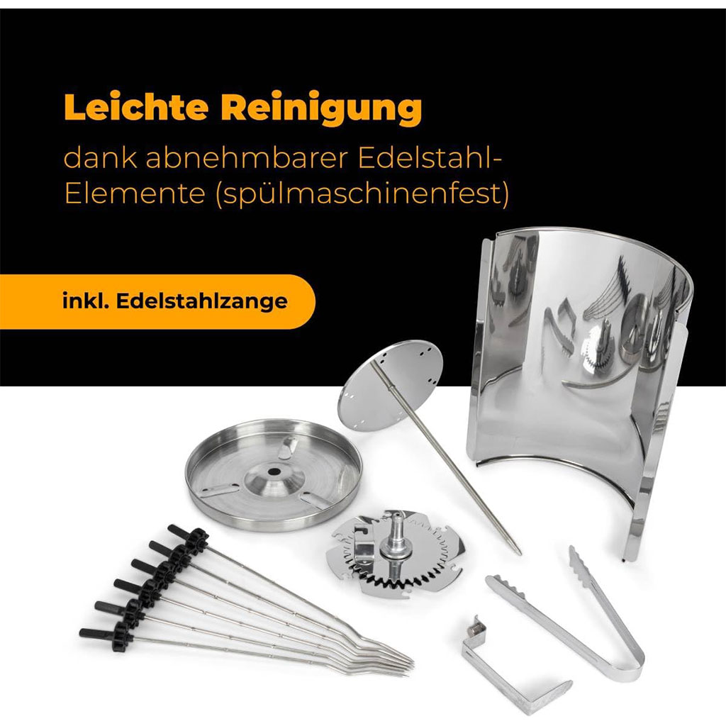 Multi-grill vertical pour griller des poulets, de la viande Kebab chawarma, des brochettes de viande sans graisse • Grâce à sa position verticale, le jus s’écoule directement dans le bac à graisse en acier inoxydable • Inclus 1 grande broche rotative pour les poulets ou la viande kebab Chawarma • Inclus 6 petites broches rotatives pour viandes et légumes • Inclus pince en acier inoxydable • Voyant lumineux • 220–240 V, 50/60 Hz, 1400 W