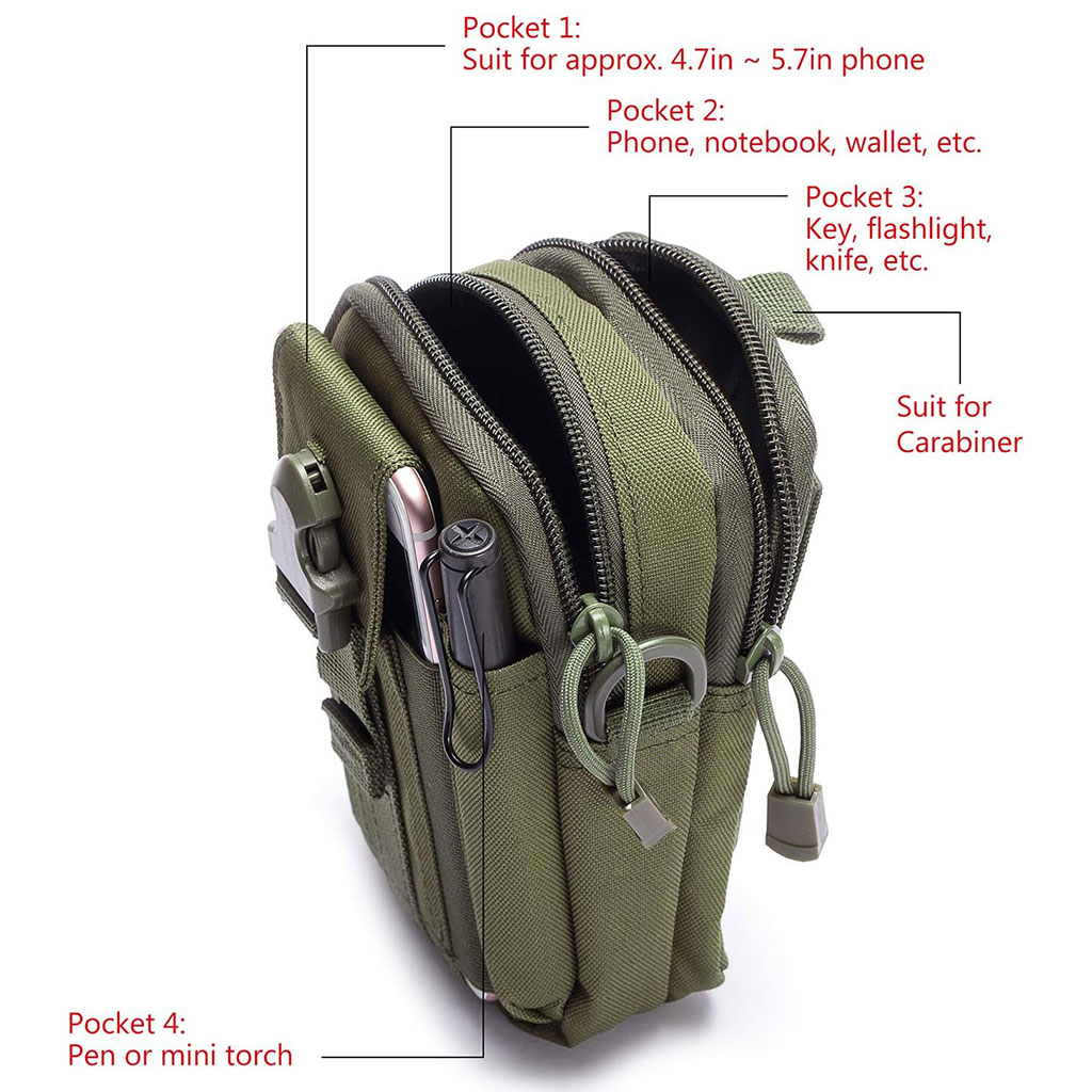 توافق عالمي مع نظام MOLLE: مزودة بأحزمة تثبيت متوافقة مع الأنظمة التكتيكية، مما يسمح لك بتركيبها بسهولة على أحزمة الخصر، السترات التكتيكية، أو حقائب الظهر الكبيرة، لتكون جزءاً لا يتجزأ من عتادك.