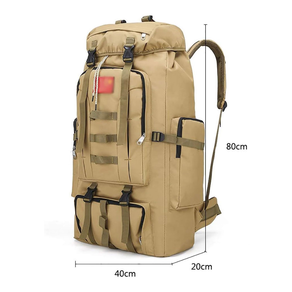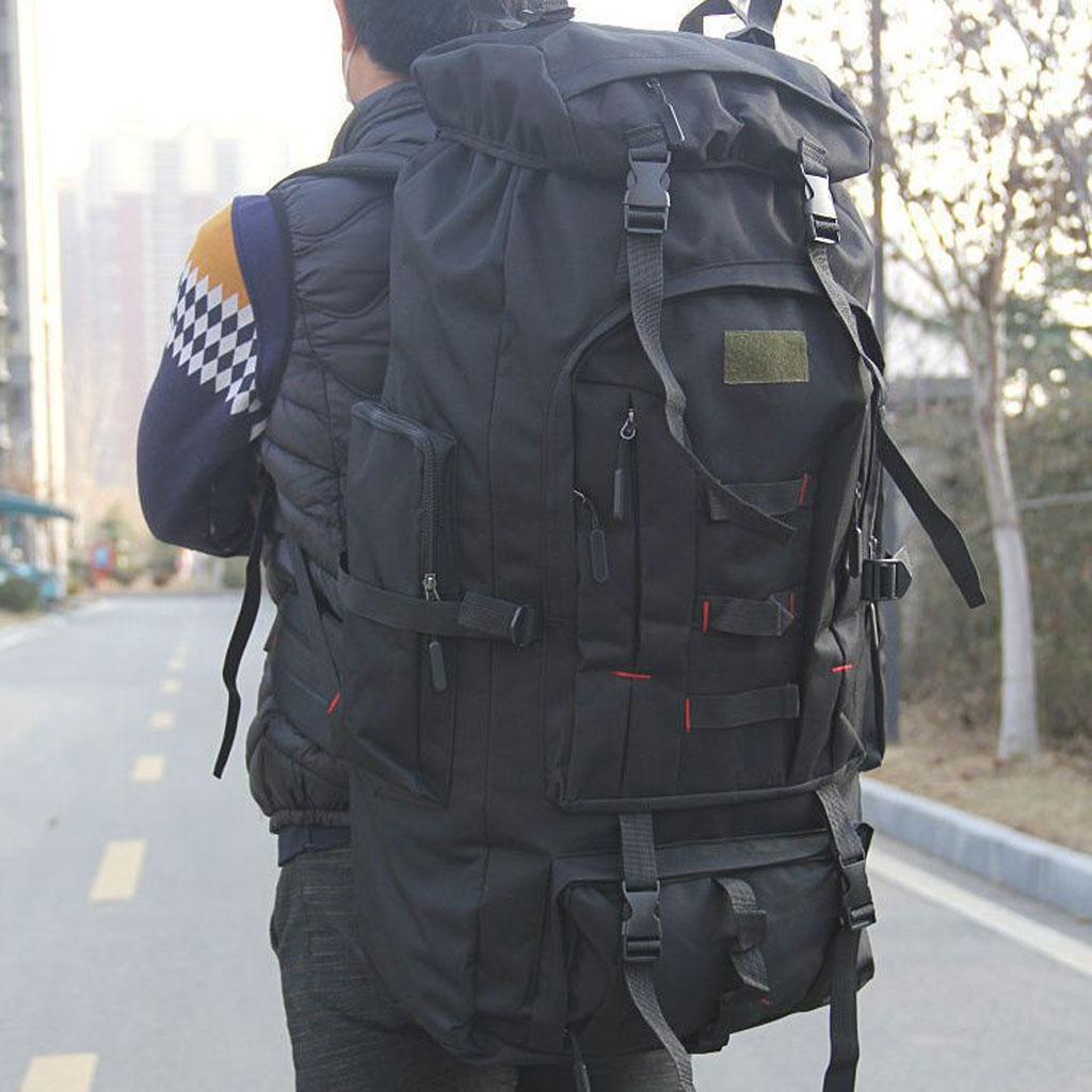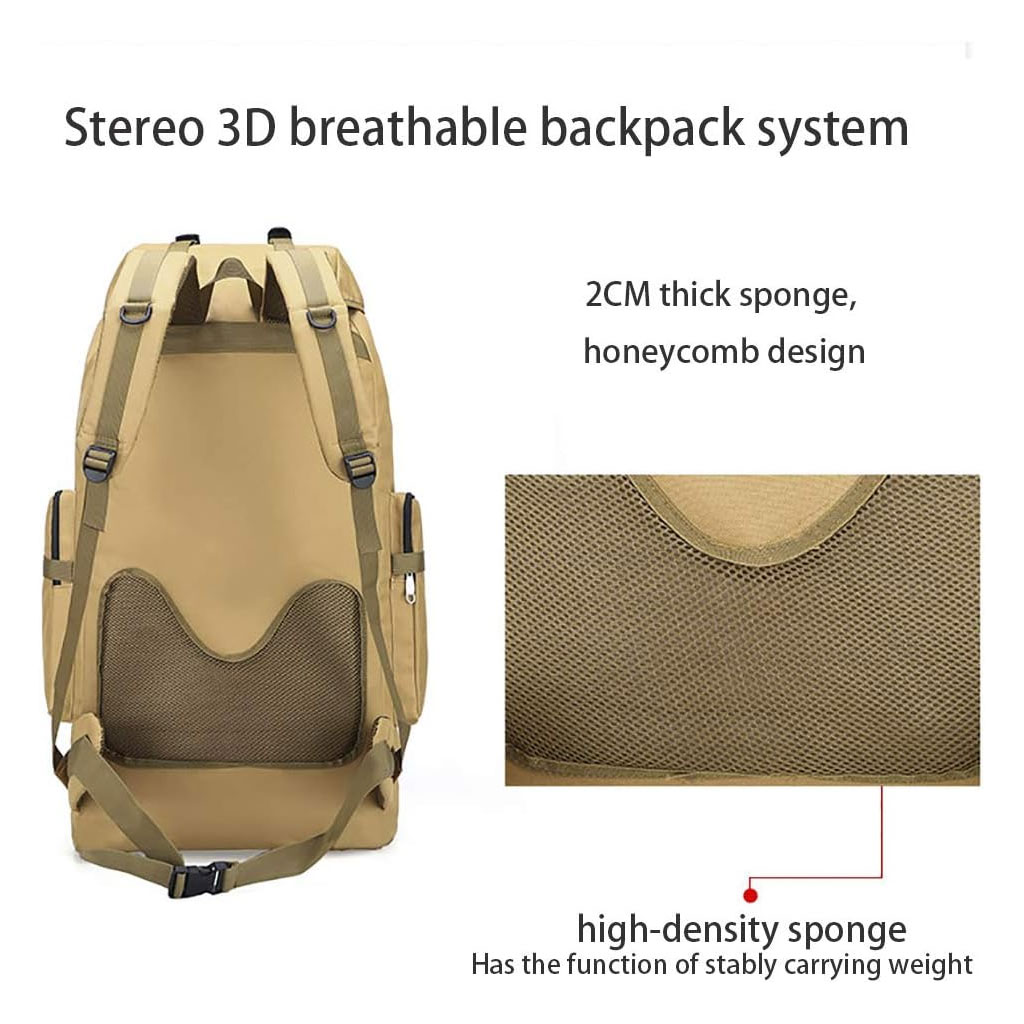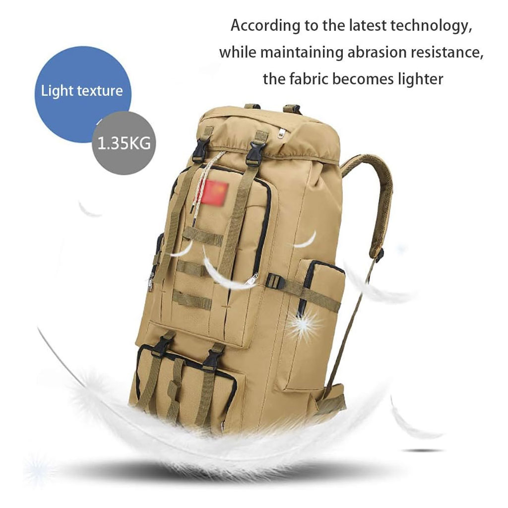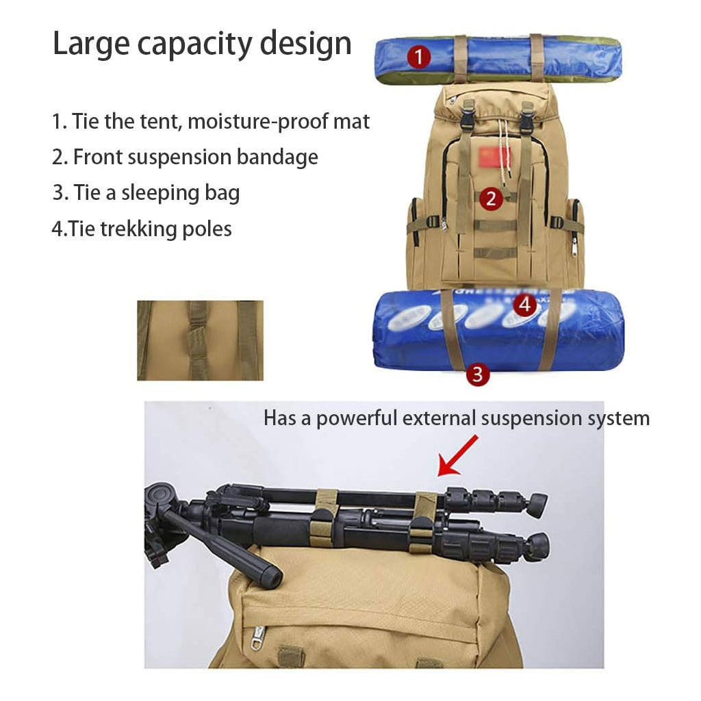 Tissu Oxford 900D ; bonne protection de l'environnement, bonne capacité de mise en forme, bonne résistance à l'eau et à la déchirure. • Le sac à dos de grande capacité de 100 L est équipé de nombreuses poches et fonctions. Il convient aussi bien aux hommes qu'aux femmes pour la randonnée, les voyages, le camping et les bagages à main. • Le coussin de dossier ventilé stéréo 3D est rempli de coton nid d'abeille ventilé de 2 cm d'épaisseur pour favoriser la circulation de l'air et avoir pour effet de dissipation de la chaleur et de réduction de la pression. • Le système de suspension externe est conçu avec des parties supérieures et inférieures, qui peuvent transporter des tentes, des sacs de couchage, etc., pour répondre aux exigences de transport de gros équipements pour les voyages. • La boucle est fabriquée en matériau PPR haute résistance respectueux de l'environnement, avec une conception épaissie, une forte capacité de charge, une résistance aux intempéries et à la corrosion. Données : Texture : filature Oxford. Degré d'étanchéité : hydrofuge. Matériau de la doublure : nylon. Convient pour la taille de l'ordinateur : 14 pouces. Y a-t-il un coussin de dos en coton : oui. Taille : 80 cm x 40 cm x 20 cm. Poids : 1,35 kg.