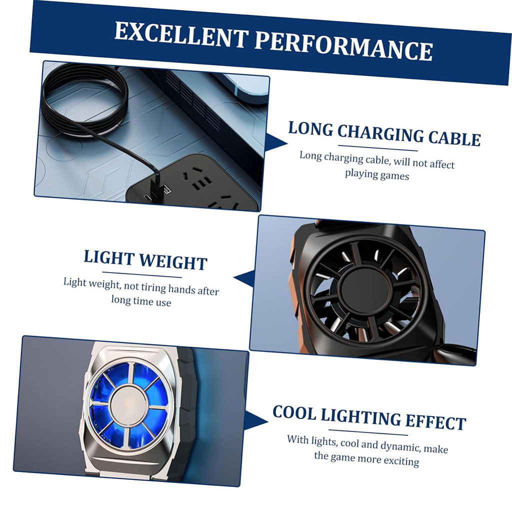 Le ventilateur de refroidissement, qui empêche le téléphone de surchauffer tout en jouant à des jeux et en regardant des vidéos, prolonge la durée de vie du téléphone et de la batterie. • Petit corps, facile à transporter, peut être utilisé à tout moment n'importe où, ne continuera pas à chauffer. • Il maintient votre téléphone en place avec des clips, vous n'avez donc pas à vous soucier de perdre la glacière après une longue utilisation ou de glisser lors de l'utilisation. • Plug and play, facile à installer sur le téléphone via un clip, il fonctionne pour Andoid et pour les téléphones intelligents allant de 11,43 à 17,78 cm/4,5 à 7 pouces. • Il se charge via un câble USB, ne couvre pas l'écran, si vous jouez longtemps, le meilleur choix.