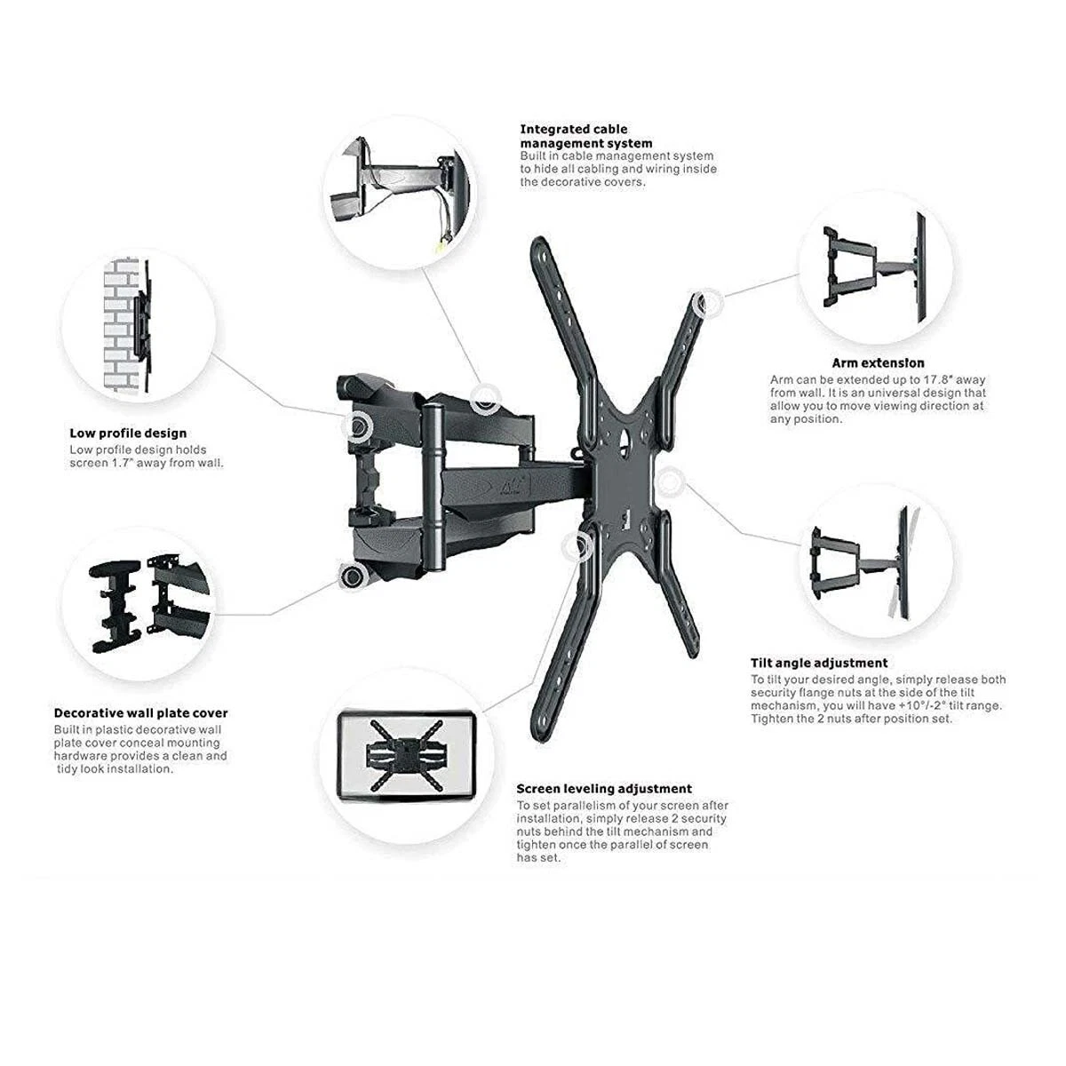 Support mural réglable pour TV avec bras pivotant et inclinable