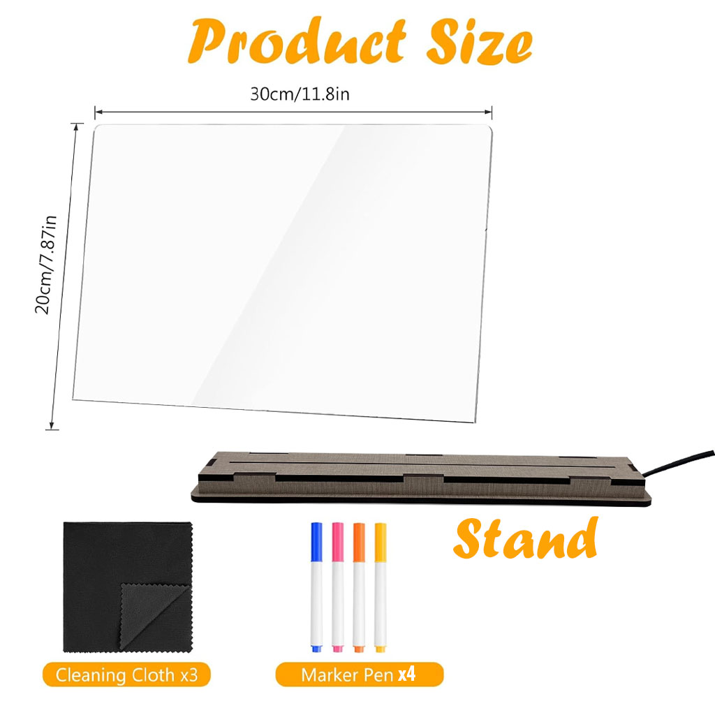 Couleurs vives : le tableau d’affichage LED dispose d’une variété de couleurs vives, ce qui le rend parfait pour créer des messages et des dessins accrocheurs qui se démarquent dans n’importe quel environnement. • Utilisation polyvalente : conçu pour de multiples applications, ce tableau d’affichage en acrylique est adapté pour les dessins d’enfants, les rappels ou les affichages créatifs, améliorant à la fois les paramètres de la maison et du bureau. • Support réglable : la planche est livrée avec un support réglable, permettant aux utilisateurs de la positionner à leur angle préféré pour une visibilité optimale, que ce soit sur un bureau ou un mur. • Facile à nettoyer : l’effacement à sec permet un nettoyage sans effort, que vous pouvez rapidement mettre à jour vos messages ou œuvres d’art sans aucun tracas ou . • Ensemble complet : ce produit comprend sept stylos colorés qui sont parfaits pour écrire ou dessiner, offrant tout ce dont vous avez besoin pour commencer à exprimer votre créativité immédiatement. Caractéristiques : Nom de la pièce : planches à dessin pour enfants. Matériau : Acrylique . Dimensions : 30x20cm Couleur : transparent. Contenu de l’emballage : 1 planche à dessin pour enfants. 1 Base Support 4 Stylo Colorés 1 Gomme