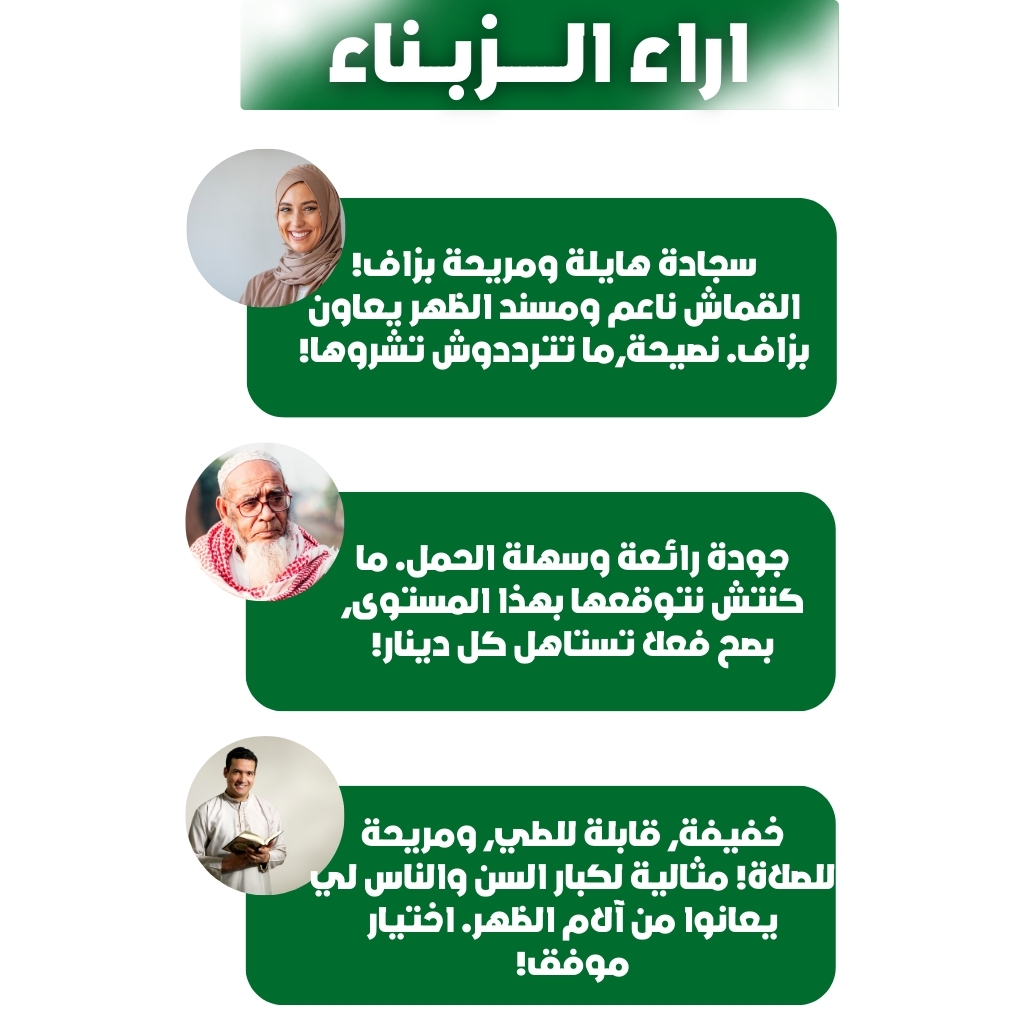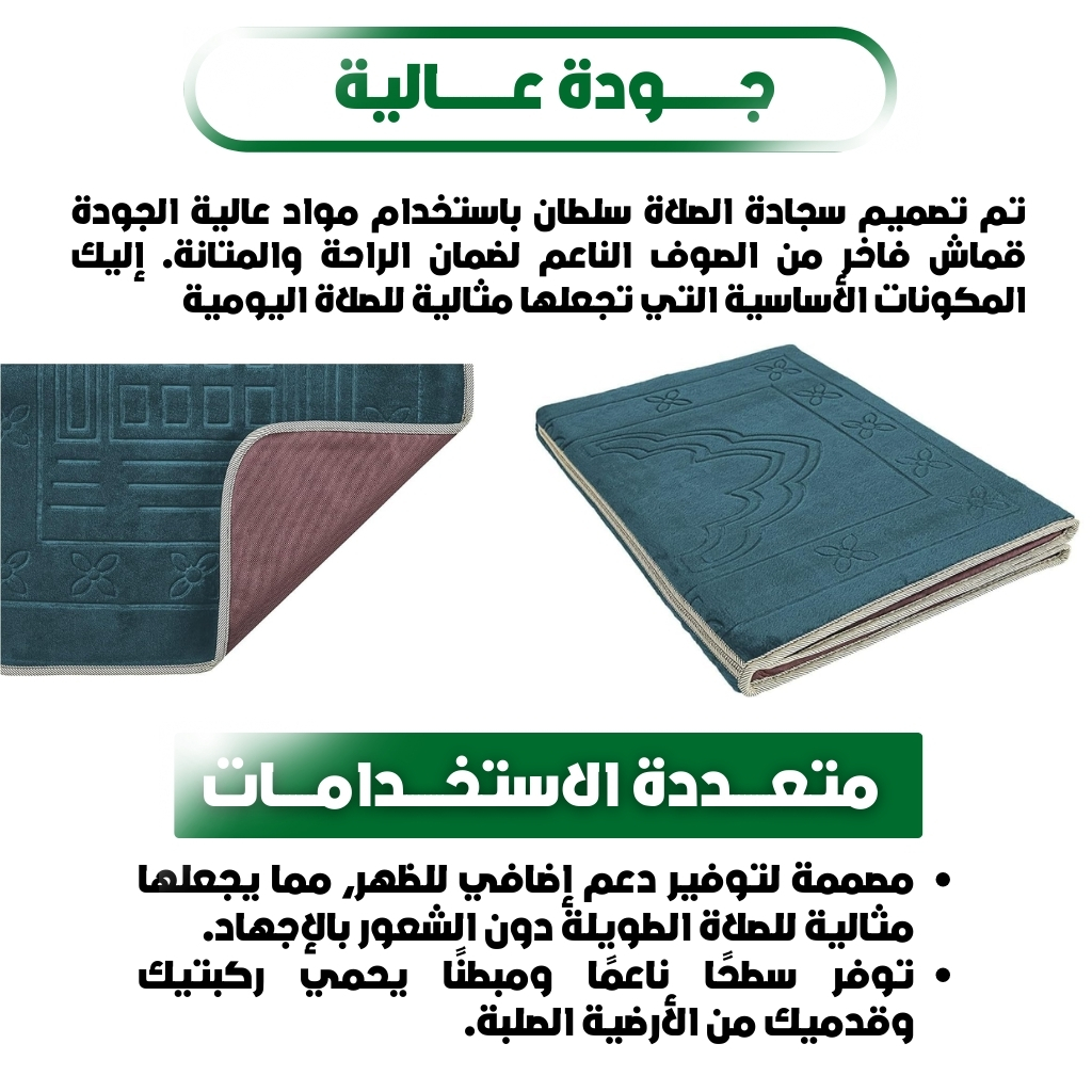 Conception Pliable avec Dossier – تصميم قابل للطي مع مسند ظهر : Ce tapis de prière innovant est doté d'un dossier intégré, offrant un soutien supplémentaire pendant les prières et facilitant son utilisation en déplacement. • Matériau en Polaire Douce – مصنوع من صوف ناعم : Fabriqué en polaire de haute qualité, il procure une sensation de confort et de douceur, rendant chaque prière agréable. • Dimensions Spacieuses – أبعاد واسعة : Avec des dimensions de 48 x 98 cm, ce tapis offre un espace suffisant pour prier confortablement. • Idéal pour les Déplacements – مثالي للتنقل : Grâce à sa conception pliable, il est facile à transporter, ce qui le rend parfait pour une utilisation à la maison, à la mosquée ou en voyage. • Cadeau Parfait – هدية مثالية : Ce tapis de prière est un excellent choix de cadeau pour les occasions spéciales telles que l'Aïd ou le Ramadan. Apportez confort et commodité à vos prières quotidiennes avec le Tapis de Prière Sultan Pliable en Polaire avec Dossier, conçu pour répondre aux besoins des fidèles modernes.