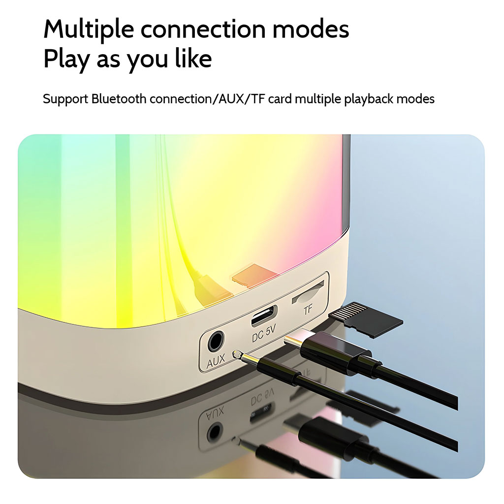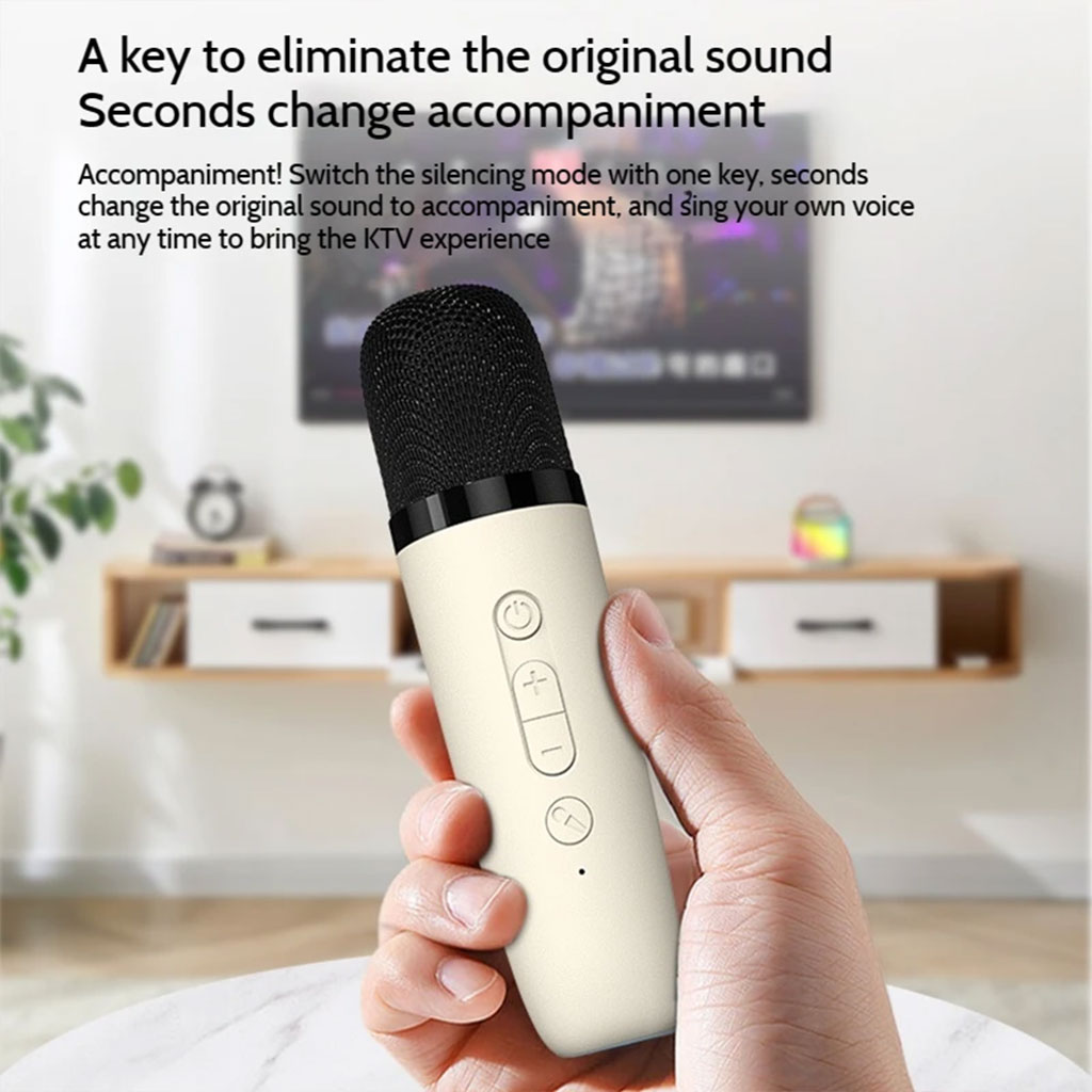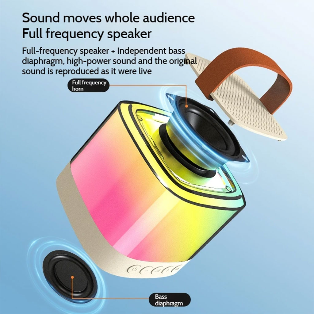 Material: plastic + acrylic + microphone 2) 3-5 hours long playback time hours 3) Rate power: 5W 52mm 4Ω 4) Frequency: 200HZ~18KHZ 5) Charging interface: Type-C USB port 6) To use 2 microphones to play Karaoke 7) Built-in rechargeable lithium battery 1200mAh 8) With Bluetooth function, support freehand call 9) Support TF card play, USB stick play and AUX play 10)Changing atmosphere lighting 11)Colors: white, pink 12)Product size: 98*98*82mm, 570g 13)Accessories: usb charging cable 14)Packing: 30pcs/ctn, ctn size 74.5*22*31.5cm, G.W. 21.5kg