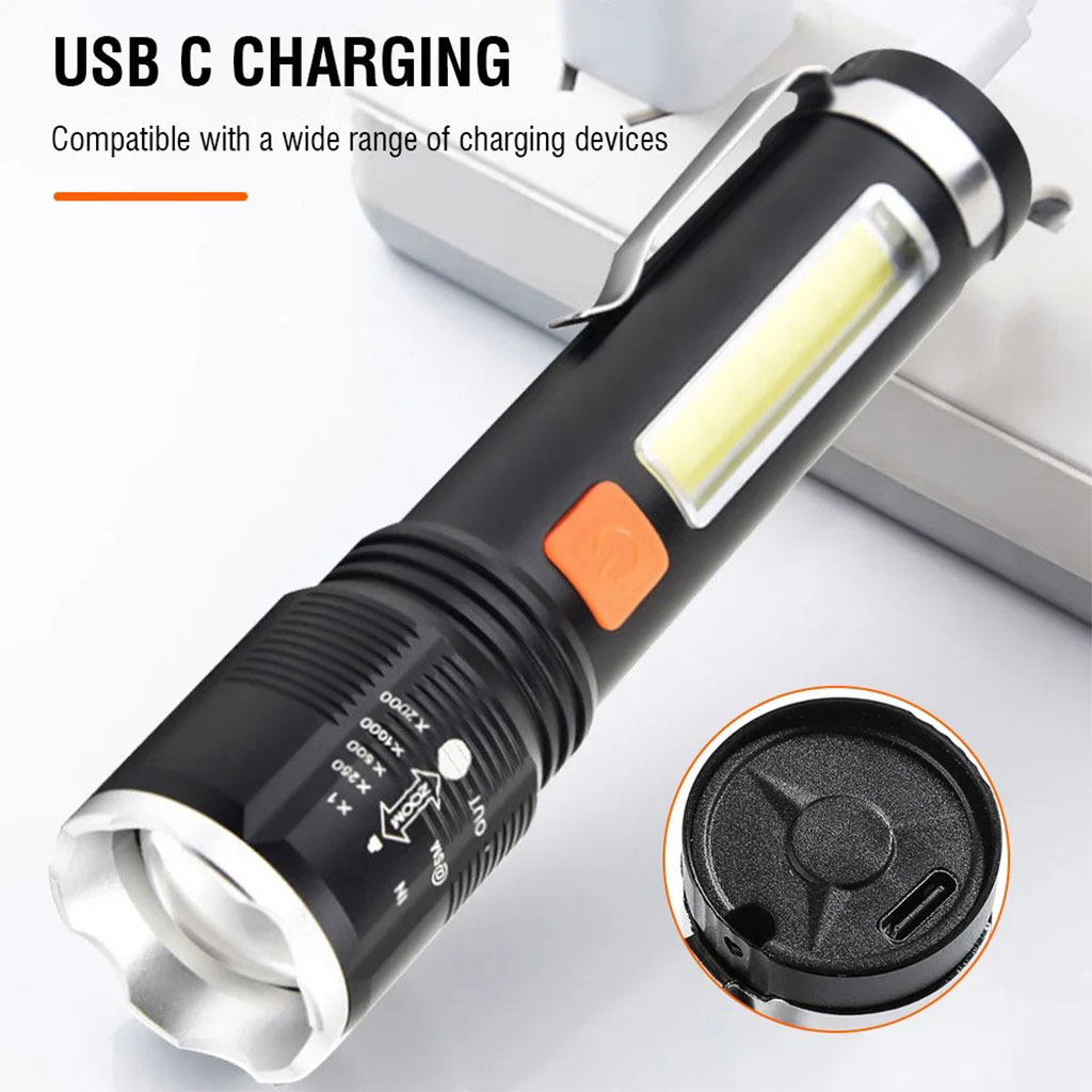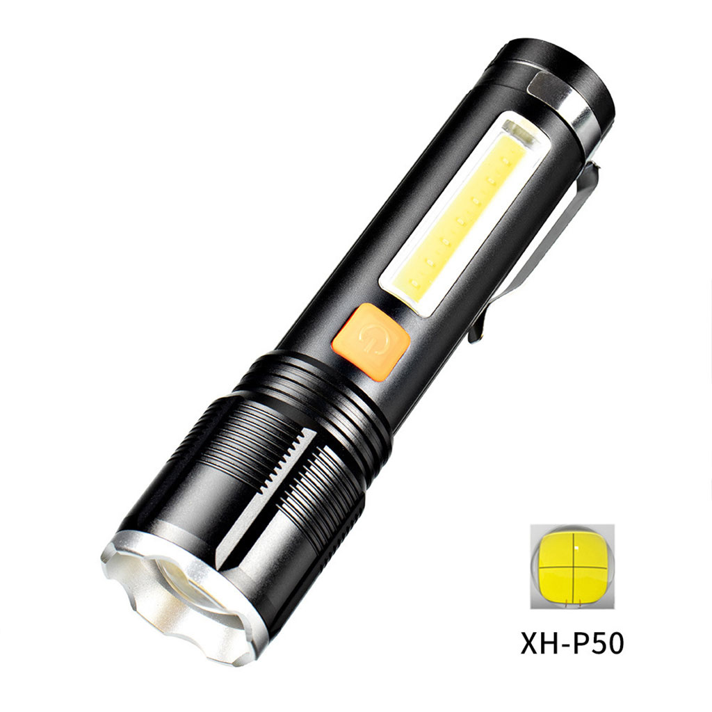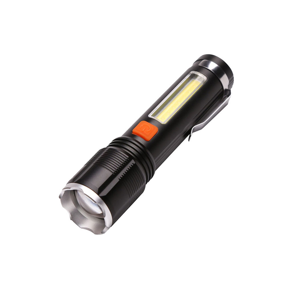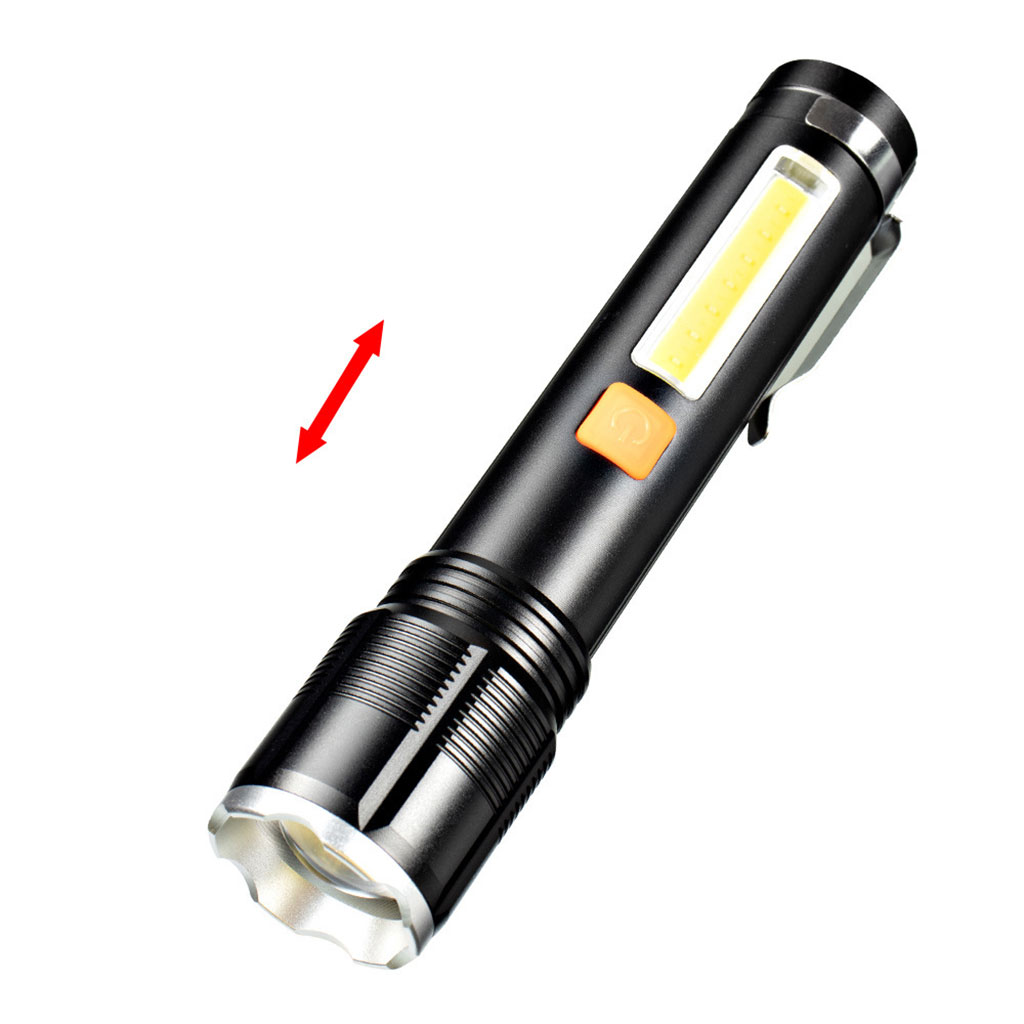 Chargement USB Ce produit a une longue durée de vie et est doté d'un dispositif anti-surcharge. Il arrête automatiquement la charge lorsqu'il est complètement chargé et est alimenté par une batterie lithium-ion rechargeable intégrée. • Conception zoom : cette lampe de poche LED peut ajuster et contrôler le champ de vision. En étendant et en contractant le corps du produit, des projecteurs circulaires peuvent être sélectionnés pour un éclairage à grande échelle, ou des projecteurs puissants peuvent être utilisés pour l'observation à distance. • MATÉRIAU EN ALLIAGE D'ALUMINIUM Cette lampe de poche est fabriquée en alliage d'aluminium, avec 10000LM et une puce LED P50 intégrée. Sa luminosité permet d'éclairer facilement toute la pièce et la cour. • 【4 modes】Cette lampe de poche LED est livrée avec 4 modes différents (lumière forte, lumière faible, lumière blanche latérale toujours allumée, lumière rouge clignotante) et un faisceau LED longue distance. Appuyez sur le bouton pour changer de mode, et différents réglages peuvent répondre à une utilisation quotidienne et à des activités de plein air. • Convient pour : Cette lampe de poche a une apparence compacte et est facile à transporter et à ranger. Elle convient au camping en plein air, à la chasse, à l'exploration, à la randonnée, à la pêche, etc.