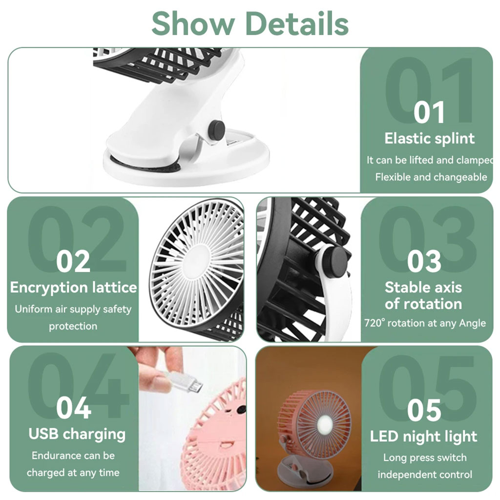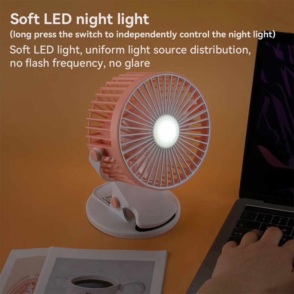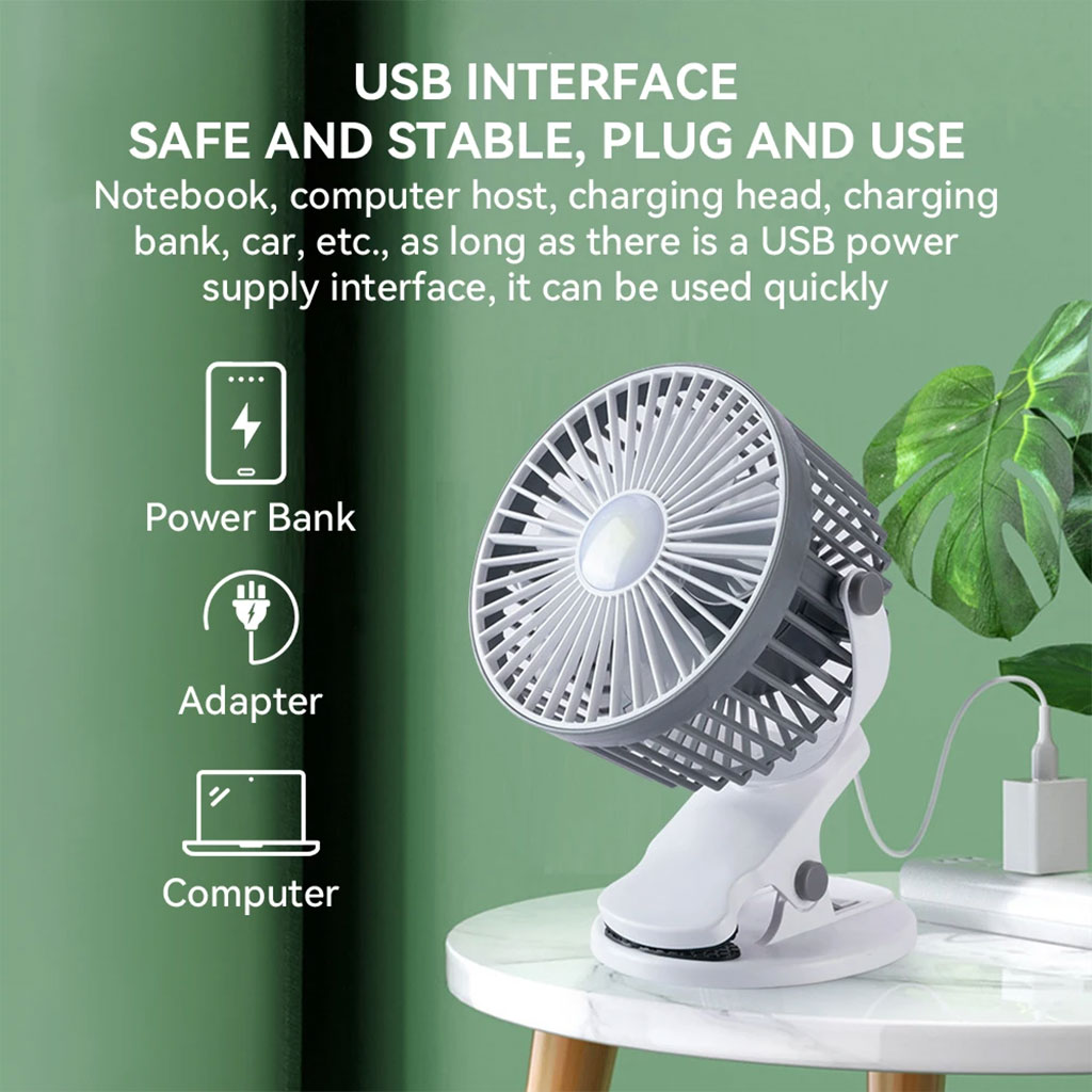 Ventilateur de bureau portable à pince réglable à 360°, rechargeable via USB